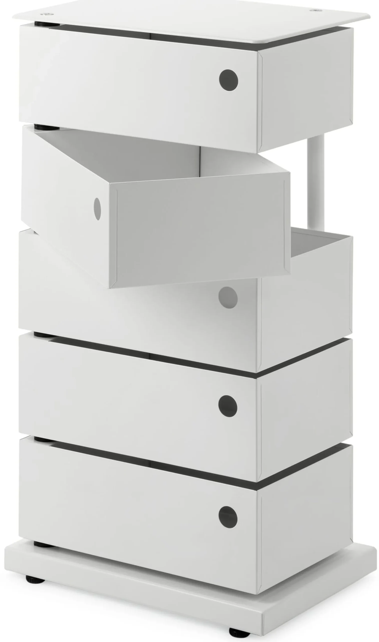 Im englischen Sprachraum „Pivot Cabinet“ genannt, verweist diese Bezeichnung – „pivot“ bedeutet so viel wie „Drehgelenk“ oder „Schwenkachse“ – auf das wesentliche konstruktive Element des Containers: Die einzelnen Laden werden an einer Achse aufgeschwenkt, nicht aufgezogen oder -geklappt, wie üblich. Diese Konstruktionsidee wurde unter anderem durch Joe Colombos 1970 entwickelten Rollcontainer „Boby“ bekannt. Der italienische Architekt war zugleich einer der führenden futuristischen Industriedesigner der 1960er Jahre, einer Zeit der Aufbruchstimmung und Zukunftsvisionen, die – folgt man beispielsweise Herbert Marcuses Gedankengang – den Weg aus dem Reich der Notwendigkeit in das Reich der Freiheit zu bahnen suchten. Entwürfe wie Verner Pantons Freischwinger „Panton Chair“, Olivier Mourgues Sessel „Djinn“, der in „2001 – Odyssee im Weltraum“ das Interieur schmückte, und Colombos „Tube Chair“ wurden zu Ikonen. Colombos „dynamische Möbelstücke“ zielten dabei stets auch auf Multifunktionalität ab.