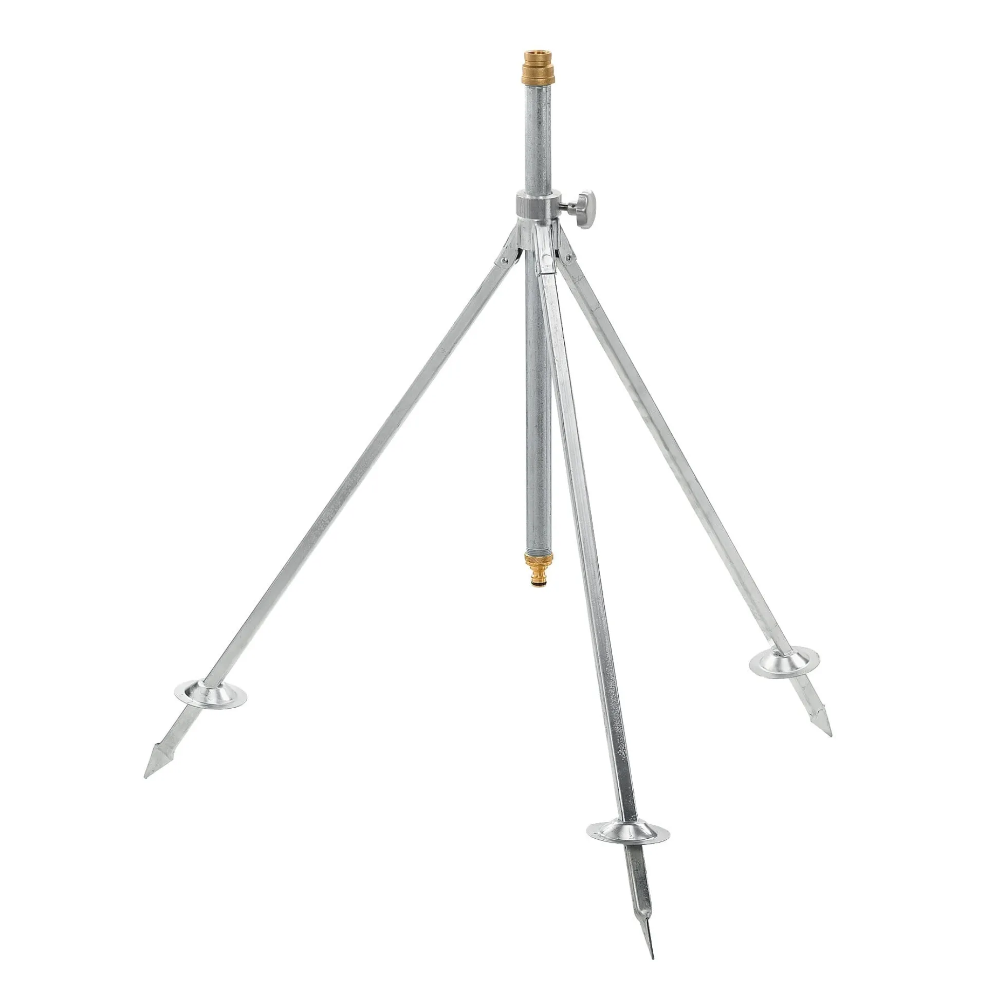 Ein klappbares Stativ für Regneraufsätze mit 1/2″-Innengewinde-Anschluss. Die Stahlteller an den drei Steckfüßen verleihen ihm in Wiese und Gartenland festen Halt. Das Zuleitungsrohr (mit einer beachtlichen Wandstärke von 2,8 mm) ist um 43 cm höhenverstellbar.