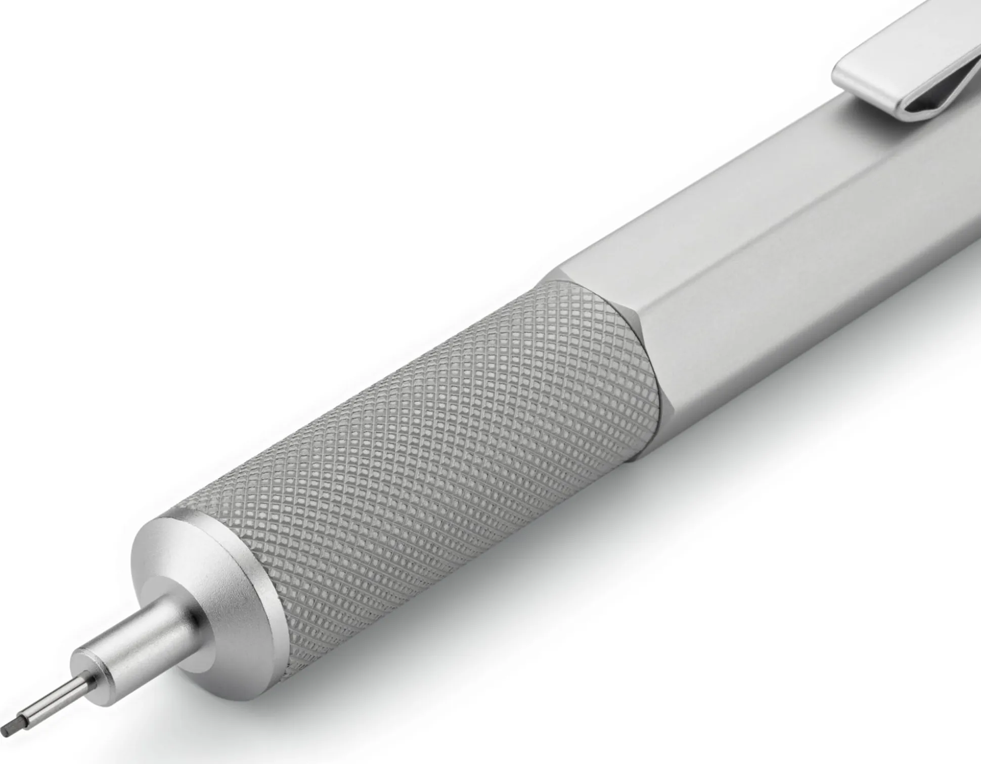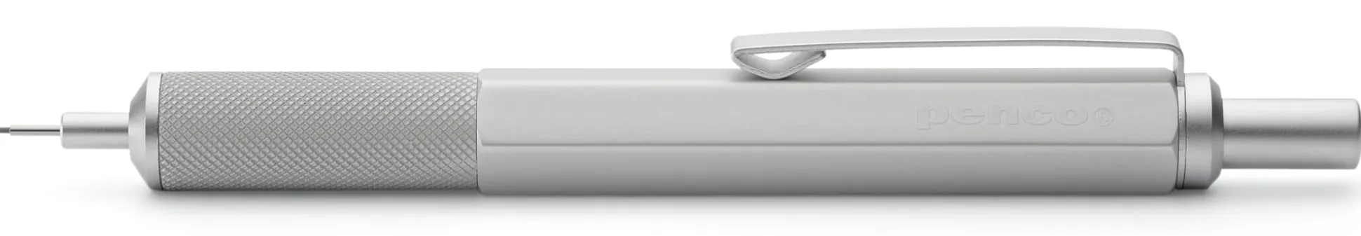 Präzise Mechanik und gutes Schreibgefühl aus Japan: Dieser an professionelle Zeichenstifte angelehnte Druckbleistift im Taschenformat ist aus Aluminium gefertigt und anschließend pulverbeschichtet – daher seine Leichtigkeit und seine widerstandsfähige Oberfläche. Der fein gerändelte Griffbereich sorgt für Halt beim Schreiben und Zeichnen, der Clip aus Federstahl beim Transport in der Tasche. Im Inneren des Drückers befindet sich ein Radiergummi.