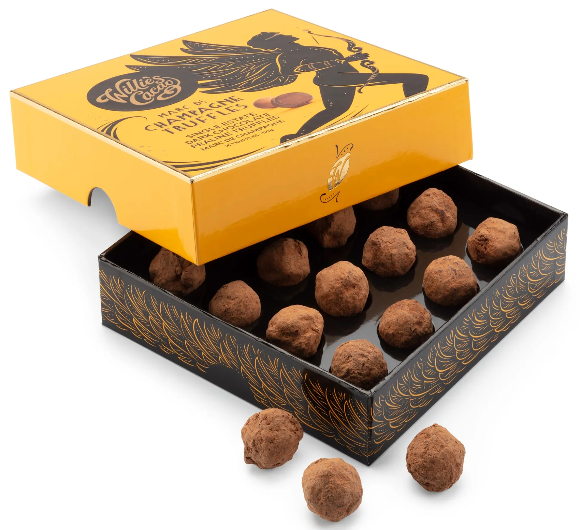 Geröstete Haselnüsse, dunkle Schokolade aus venezolanischen Kakaobohnen und ein Schuss Marc de Champagne geben diesen in Schokolade getauchten und mit Kakao bestäubten Trüffeln ihren vollen, komplexen Geschmack und eine geschichtete Textur. Die schöne Umverpackung kann nach dem Genuss kreativ weiterverwendet werden.