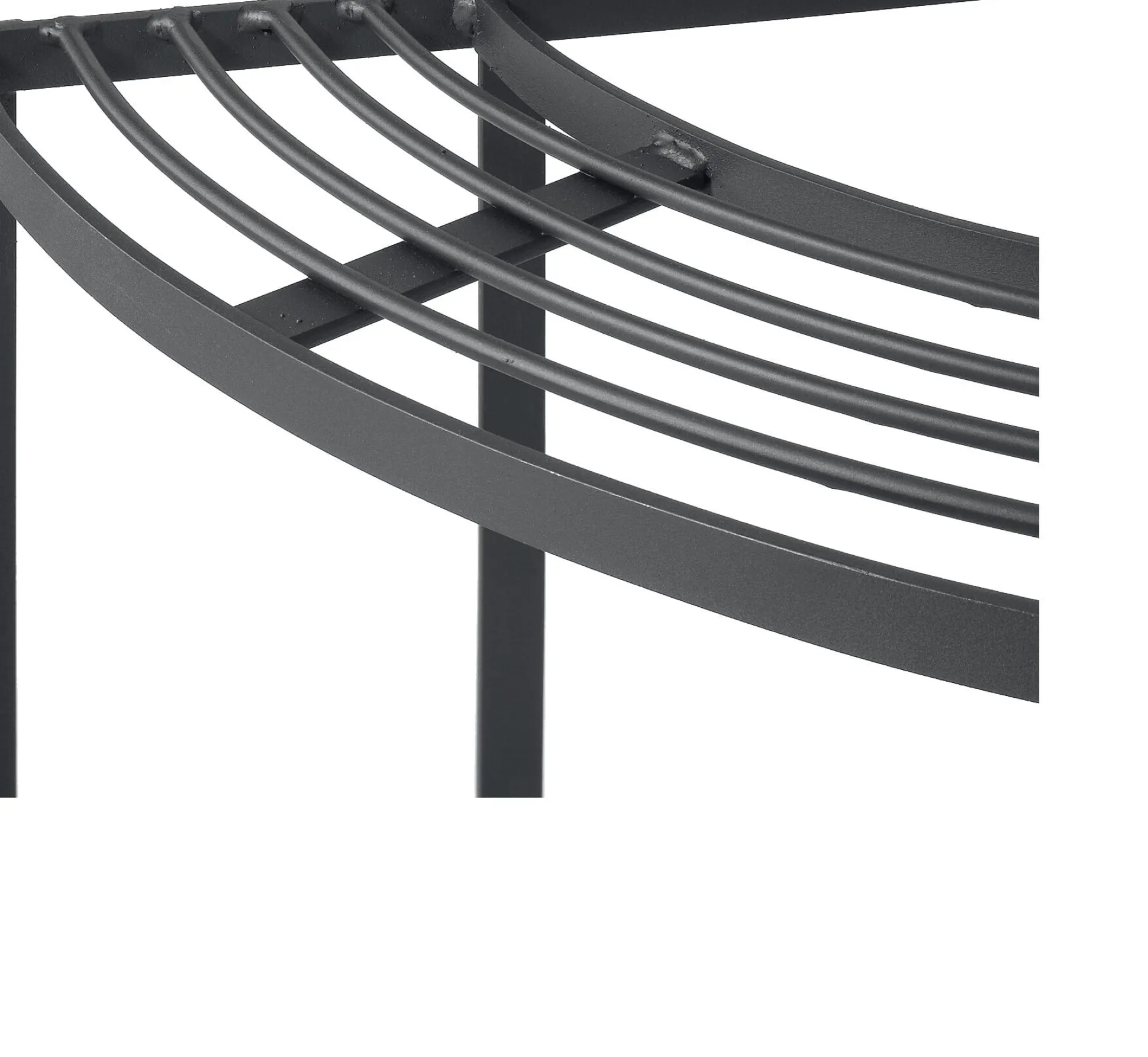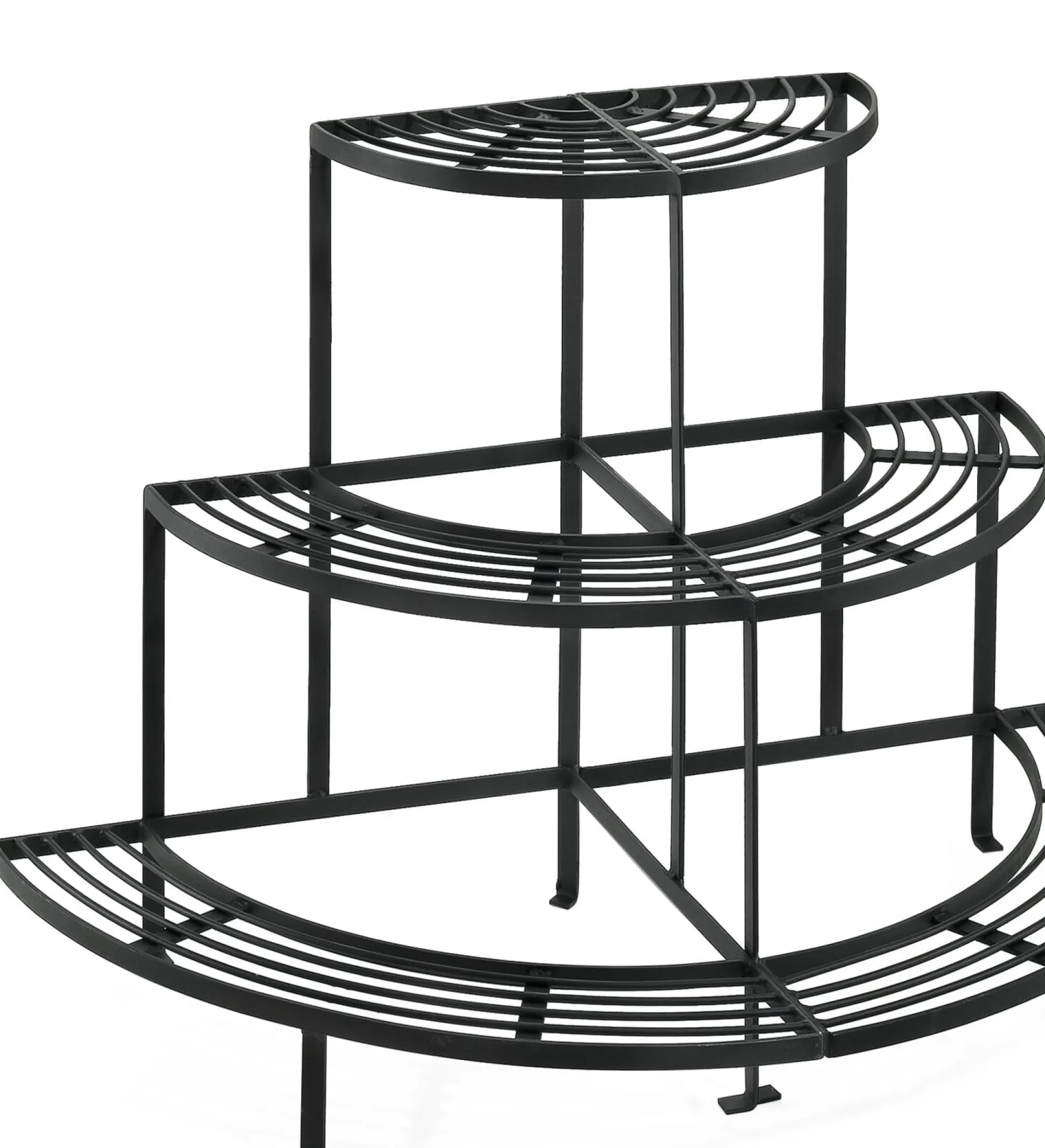 Wirklich stabil und ein schöner Blickfang auf jedem noch so kleinen Balkon ist diese Blumentreppe in Form eines Viertelkreises. Das Eckregal ist aus einem Stück Stahl von ordentlicher Stärke geschweißt und steht schon aufgrund seines Eigengewichts fest und sicher, ohne zu kippeln. Auf Hof und Terrasse lassen sich aus zwei oder vier Regalen Halb- oder Vollkreise zusammenstellen; auf der untersten Etage finden auch größere Blumentöpfe Platz.