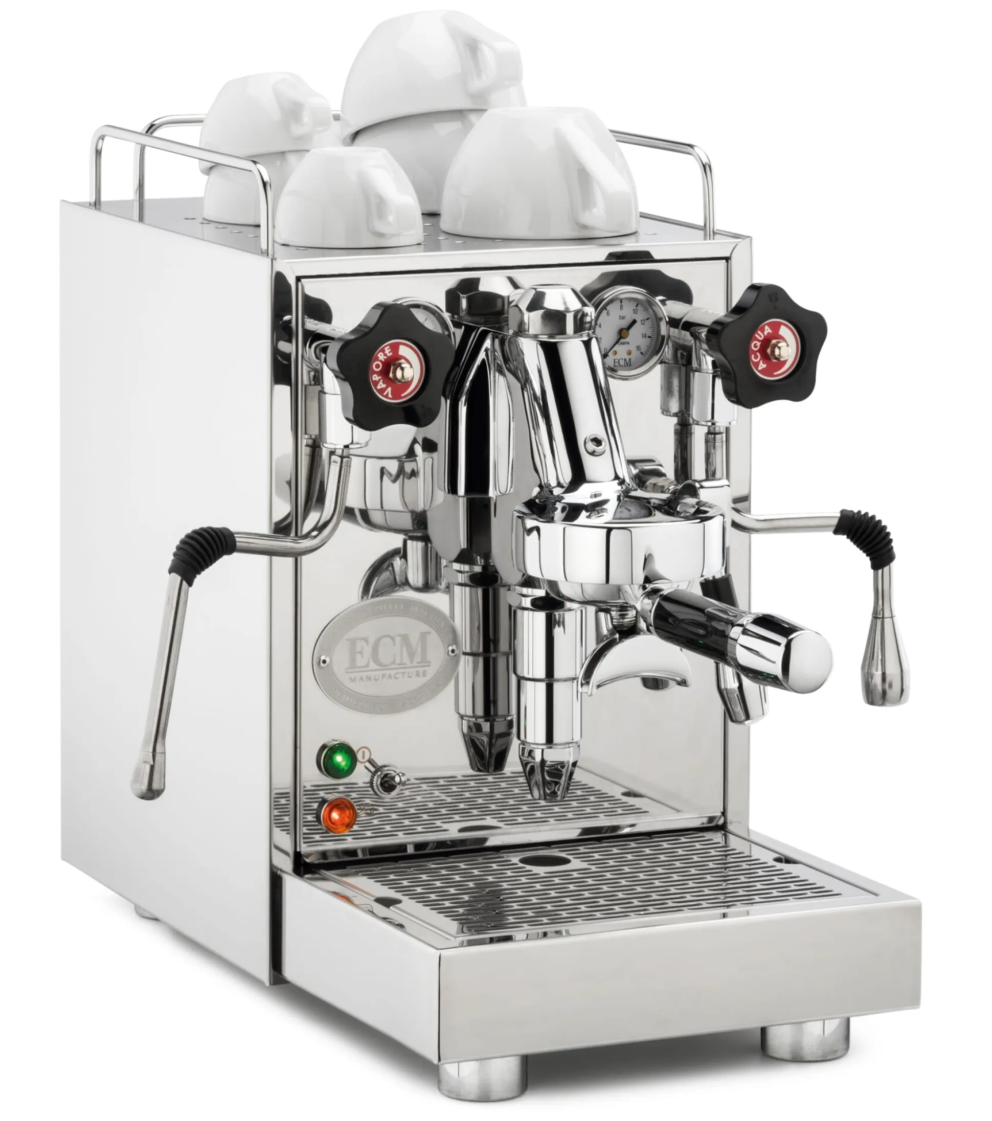 Zweikreis-Maschine mit Vibrationspumpe und Thermo-Siphon-System. ECM-E61-Brühgruppe. Gehäuse und Kessel (Volumen 2,2l) aus Edelstahl, außen hochglanzpoliert; drei Kesseltemperaturen sind voreingestellt (120°C, 124°C, 128°C). Frischwassertank (Volumen 2,8 l) aus Kunststoff. Drehventile.