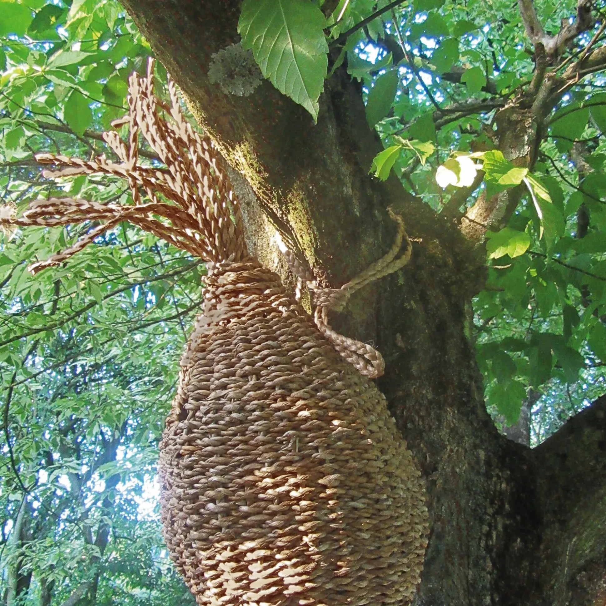 - Von Hand um einen stabilen Metallrahmen geflochten