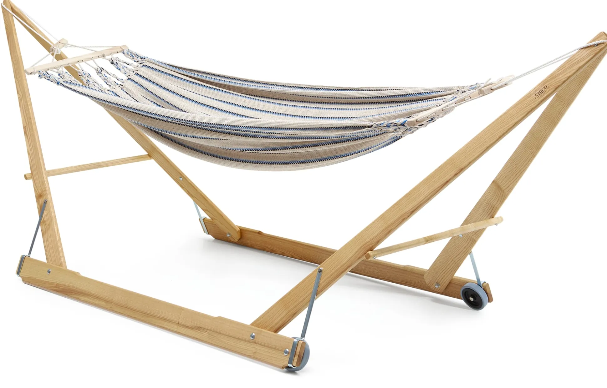 Die Hängematten werden in einer eigens entwickelten Endloswebtechnik gearbeitet, sie sind nicht nur von einer Materialopulenz, die man schon beim ersten Griff spürt – sie sind vor allem auch außerordentlich reißfest. Ein verstellbarer hölzerner Fixierstab verhindert das Zusammenrutschen der Matte, eine Spannvorrichtung ermöglicht Längenänderungen. Einzig beim Tragseil verwendet der Hersteller ein synthetisches Material, eine UV- und witterungsbeständige Polyestermischung, die die langfristige Belastbarkeit der Hängematte gewährleistet.