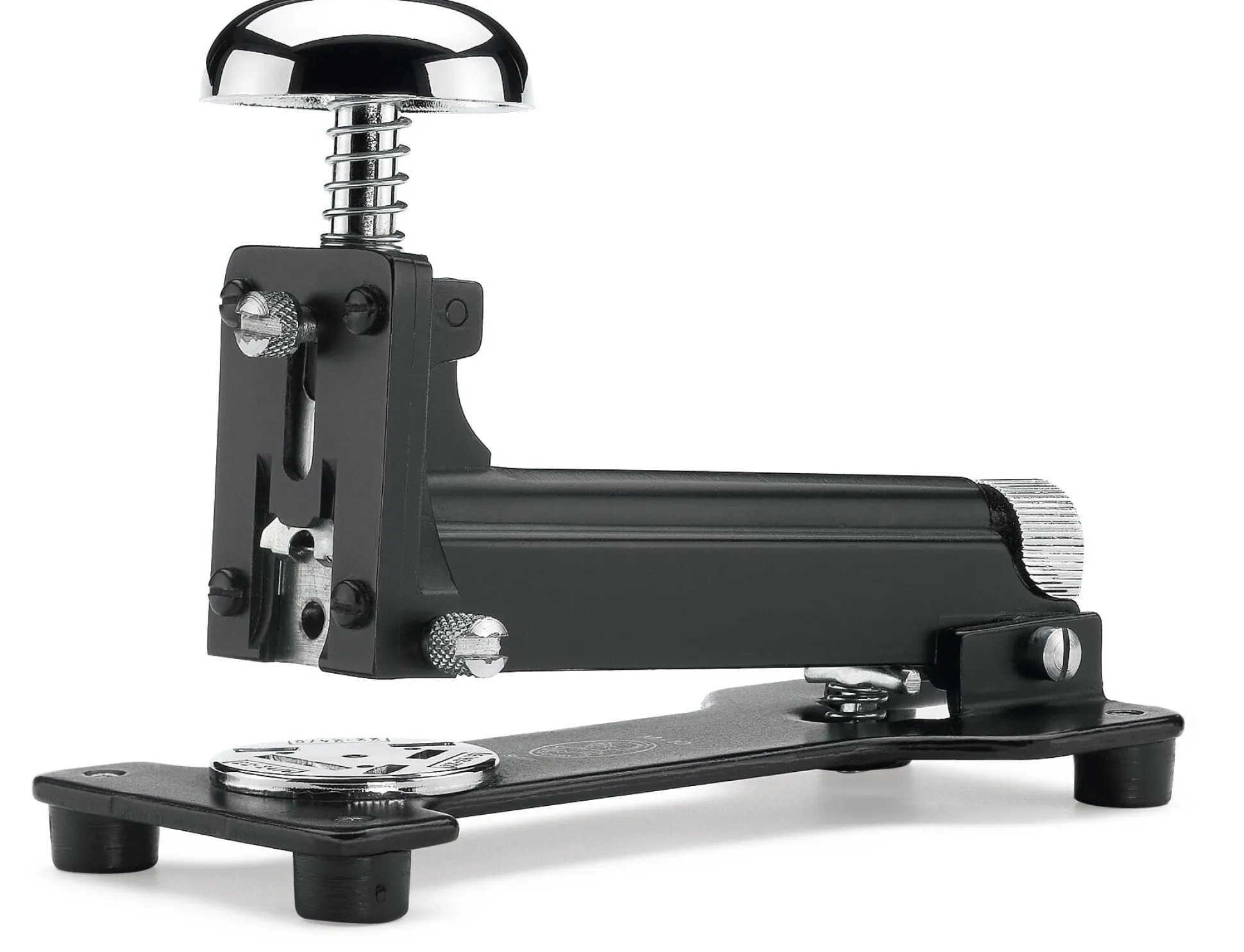 Im Jahr 1934 begann die spanische Feuerwaffenfabrik El Casco mit der Herstellung ziviler Produkte und erwarb sich in der Folgezeit einen hervorragenden Ruf, verbunden allerdings mit einem nicht minder hervorragenden Preisniveau. Dieses ist vor allem der Vorliebe der Entwickler für hochglanzverchromte und vergoldete Oberflächen sowie der herausragenden Verarbeitung geschuldet. Alle Teile sind exakt aufeinander eingestellt und handjustiert. Wir haben zwei El Casco Tischhefter – glanzverchromt und in schlichtem Schwarz – im Programm. Das schwarze Gerät gehört (glauben Sie’s oder glauben Sie es nicht) zu den preiswertesten Modellen des Herstellers.