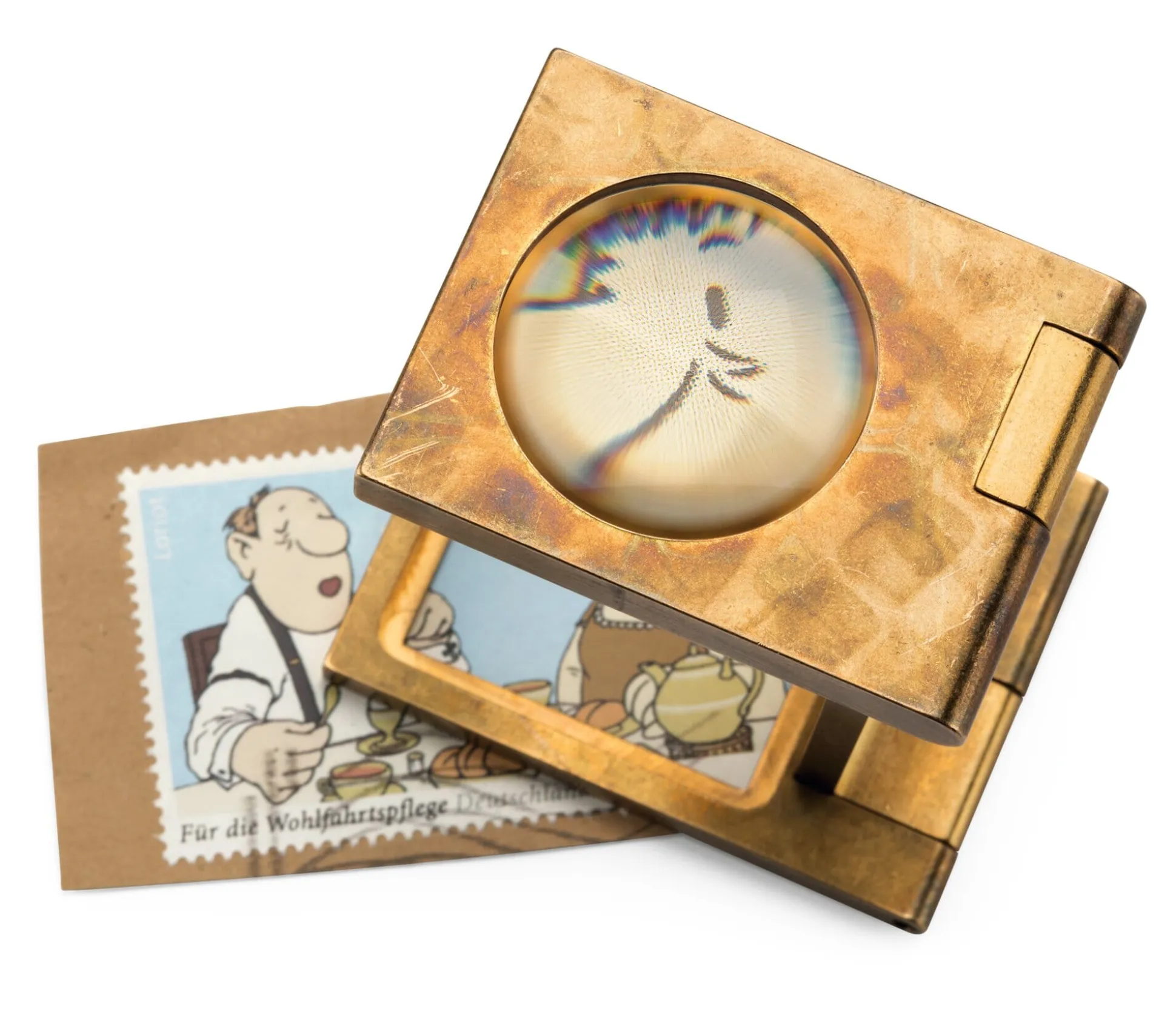 Faltbarer Fadenzähler aus rohem Messing. Mit bikonvexer Silikatglas-Linse. Ohne Skala.