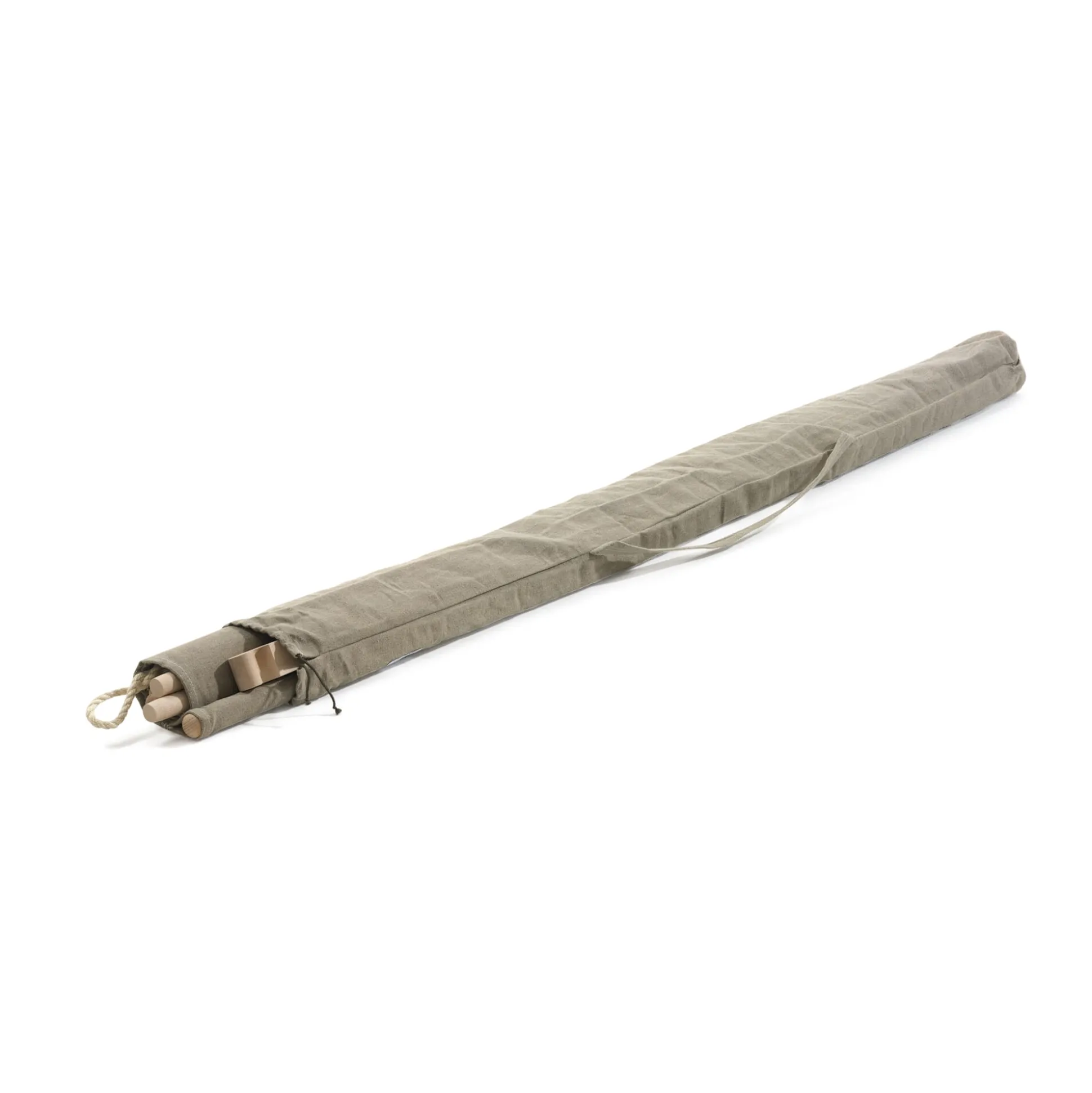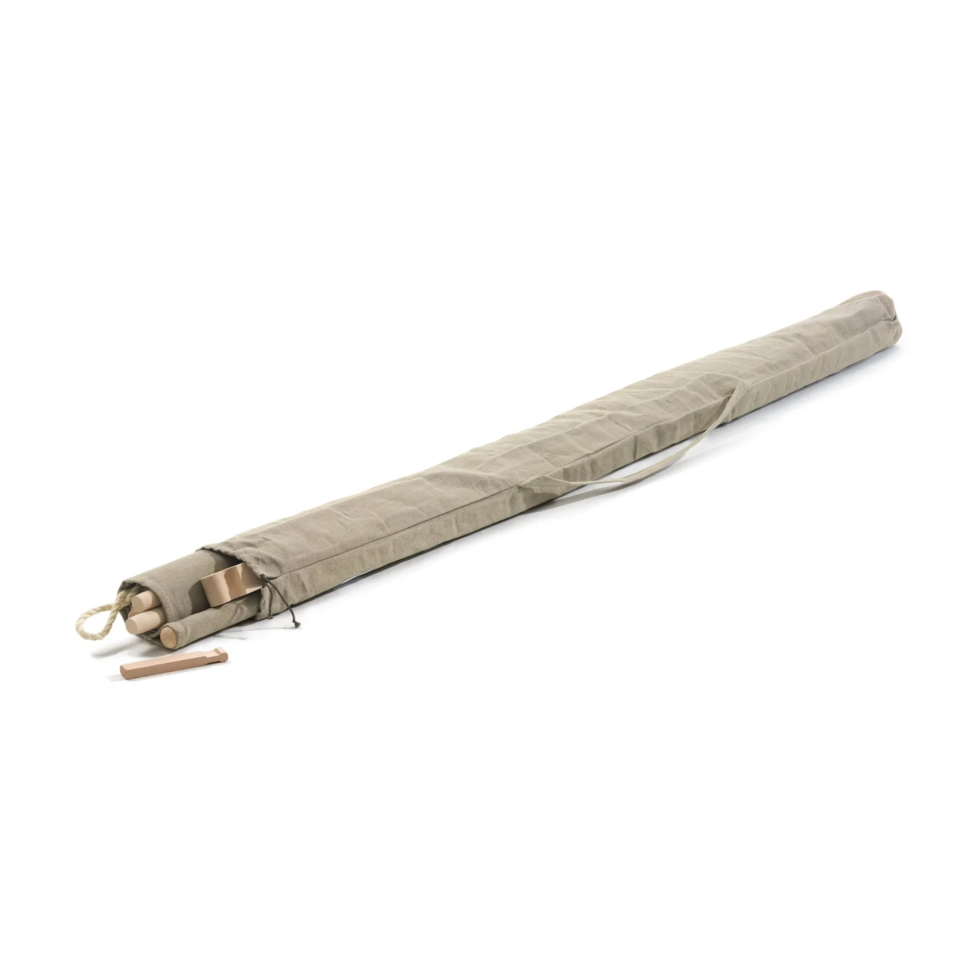 Optisch nimmt sich das Faltbett wohltuend zurück. Dank der geringen Höhe sind selbst Dachschrägen kein Hindernis und nicht zuletzt lässt es sich – es wiegt nur 8,1 kg – mühelos von Zimmer zu Zimmer oder in den Garten tragen. Die robusten, sorgfältig verarbeiteten Materialien – unbehandeltes, massives Buchenholz und ungebleichtes, schweres Leinengewebe – sind ein Mobiliar gewordenes Zurück zur Natur. Zugleich unterstreichen sie den Charakter des Bettes als puristisches Basisstück. Die minimalistische Konstruktion folgt dem Motto: Weniger ist mehr. Zerlegt, zusammengerollt und im mitgelieferten Leinenköcher verpackt, lässt sich das Faltbett auf kleinstem Raum verstauen. Das lange, schmale Bündel kann dazu einfach hochkant in die Ecke gestellt werden. Weniger Bett geht nicht und mehr Bett braucht es nicht.