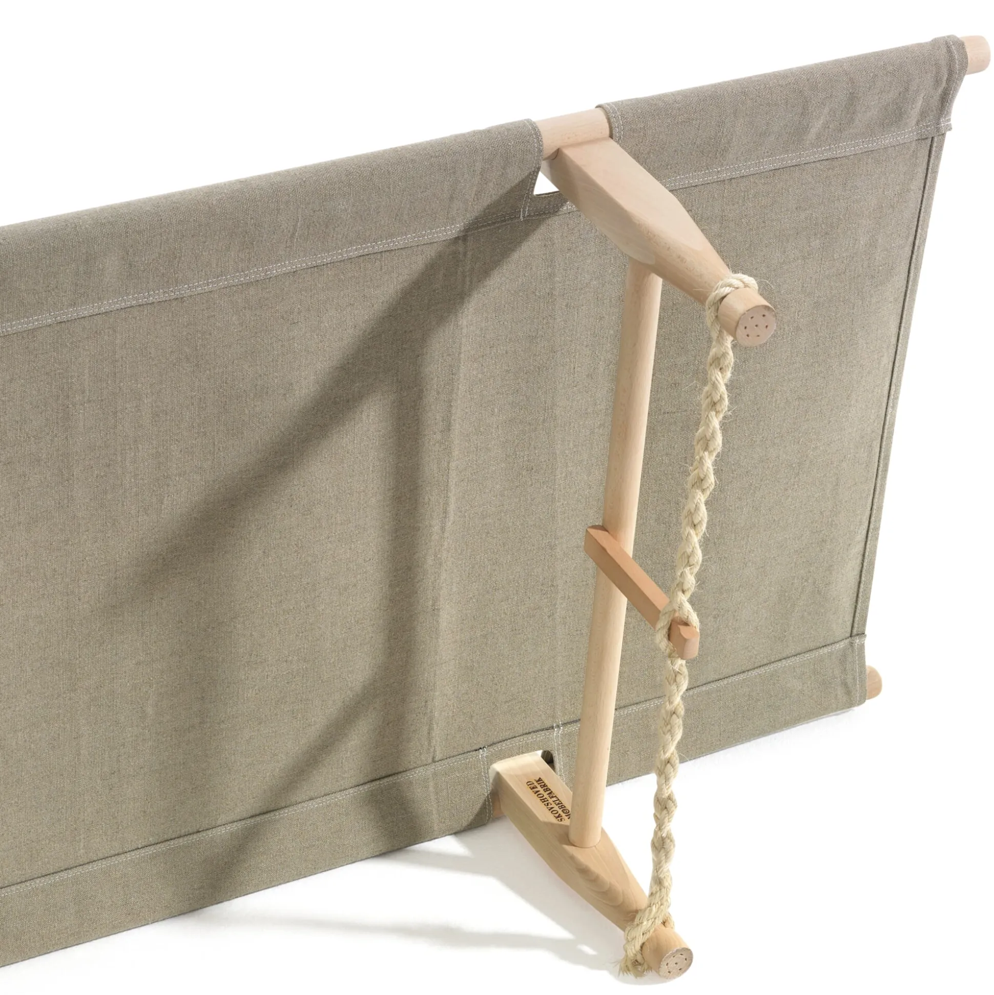 Gestell aus massivem Buchenholz (Herkunft Polen) unbehandelt. Auflage und Transporttasche 100 % Leinen (Flächengewicht 720 g/qm), Hanfseile. Länge 203 cm, Breite 75 cm, Höhe 35 cm. Packmaß Ø 11 cm, Länge 210 cm. Gewicht 8,1 kg. Lieferung per Spedition.