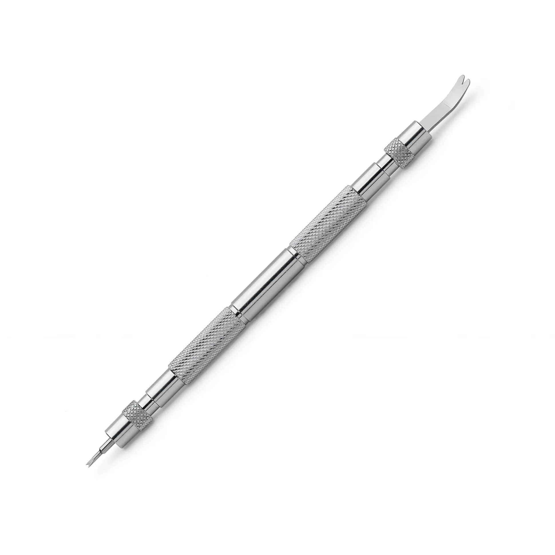 Dieses hilfreiche Uhrmacherwerkzeug in Ganzmetallausführung ist unentbehrlich für das Auswechseln von Lederarmbändern ohne Beschädigung des Uhrgehäuses. Mit ihm gelingt der Wechsel denkbar leicht. Die beiliegende Zeichnung zeigt, wie es geht: Das gabelförmige Ende des Werkzeugs wird so in die schmale Lücke zwischen Uhrgehäuse und -armband geführt, dass es den Federsteg zu fassen bekommt, der dann vorsichtig erst auf der einen, dann auf der anderen Seite gelöst werden kann.