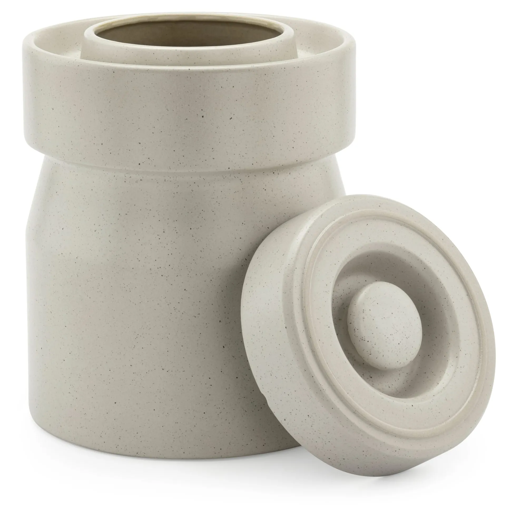 Aus Keramik. Volumen 7 l. Ø 22,5 cm. Höhe ohne Deckel 26 cm, mit Deckel 29 cm. Einfüllloch Ø 12,5 cm. 2 Beschwerungssteine (Ø 18 cm) inklusive. Gesamtgewicht 4,6 kg. Eine Anleitung liegt bei.