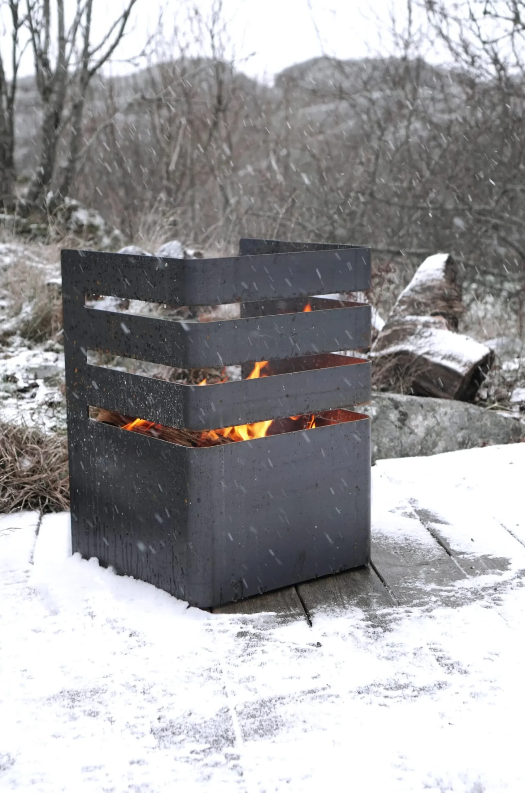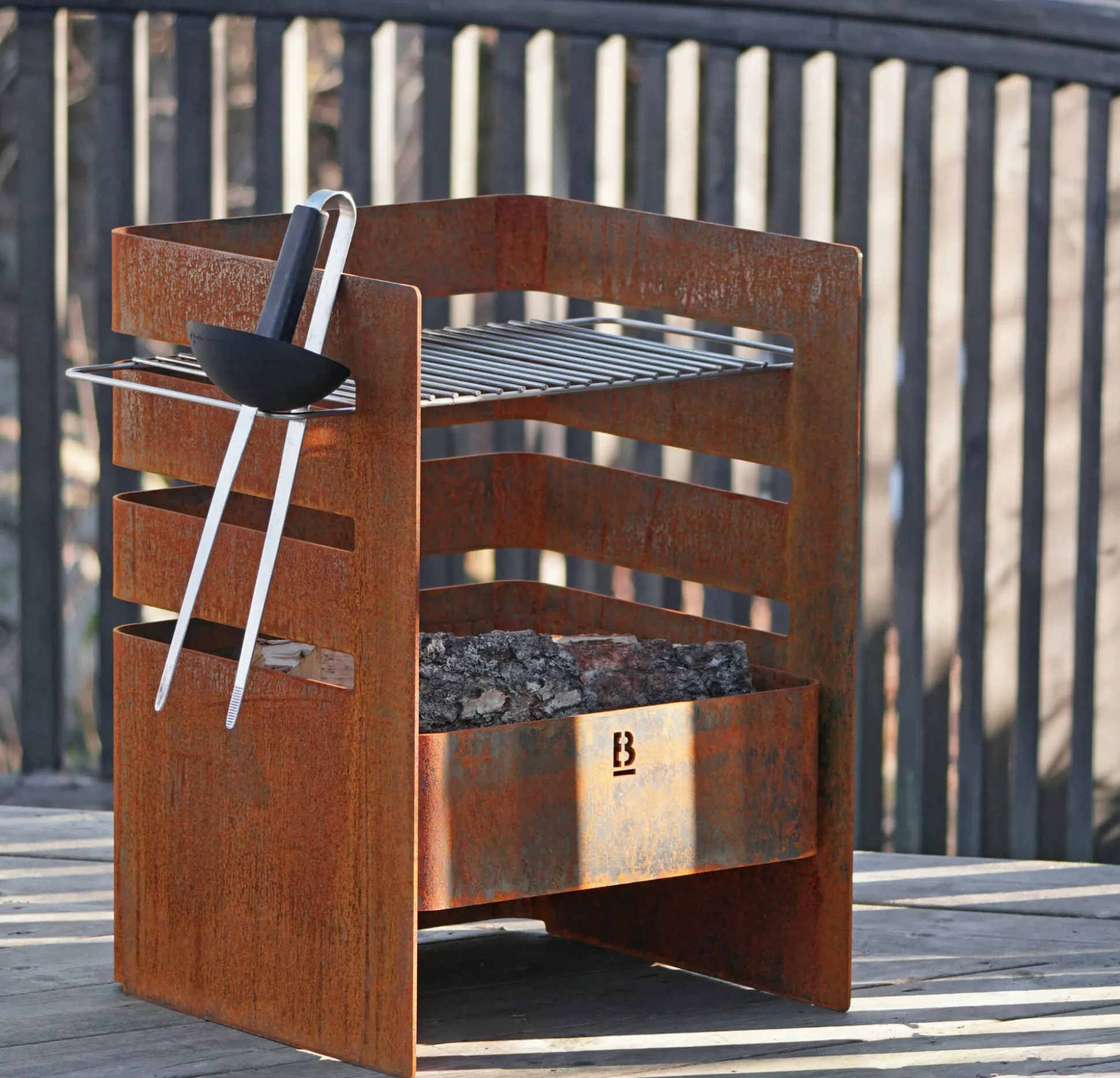 Gefertigt in Schweden und aus Corten®-Stahl: FUEGO ist Feuerstelle und Grill in einem. Corten®-Stahl ist ein spezielles Material: korrosionsbeständig, anfangs stahl-grau nimmt es im Laufe der Zeit durch Witterungseinfluss eine rostähnliche, rotbraune Farbe an. Dies geschieht durch einen Oxidationsprozess, der den Stahl schützt und ihn völlig witterungsbeständig macht. FUEGO ist ausgestattet mit einem Grillrost aus Edelstahl, der in drei verschiedenen Höhen einhängbar ist.