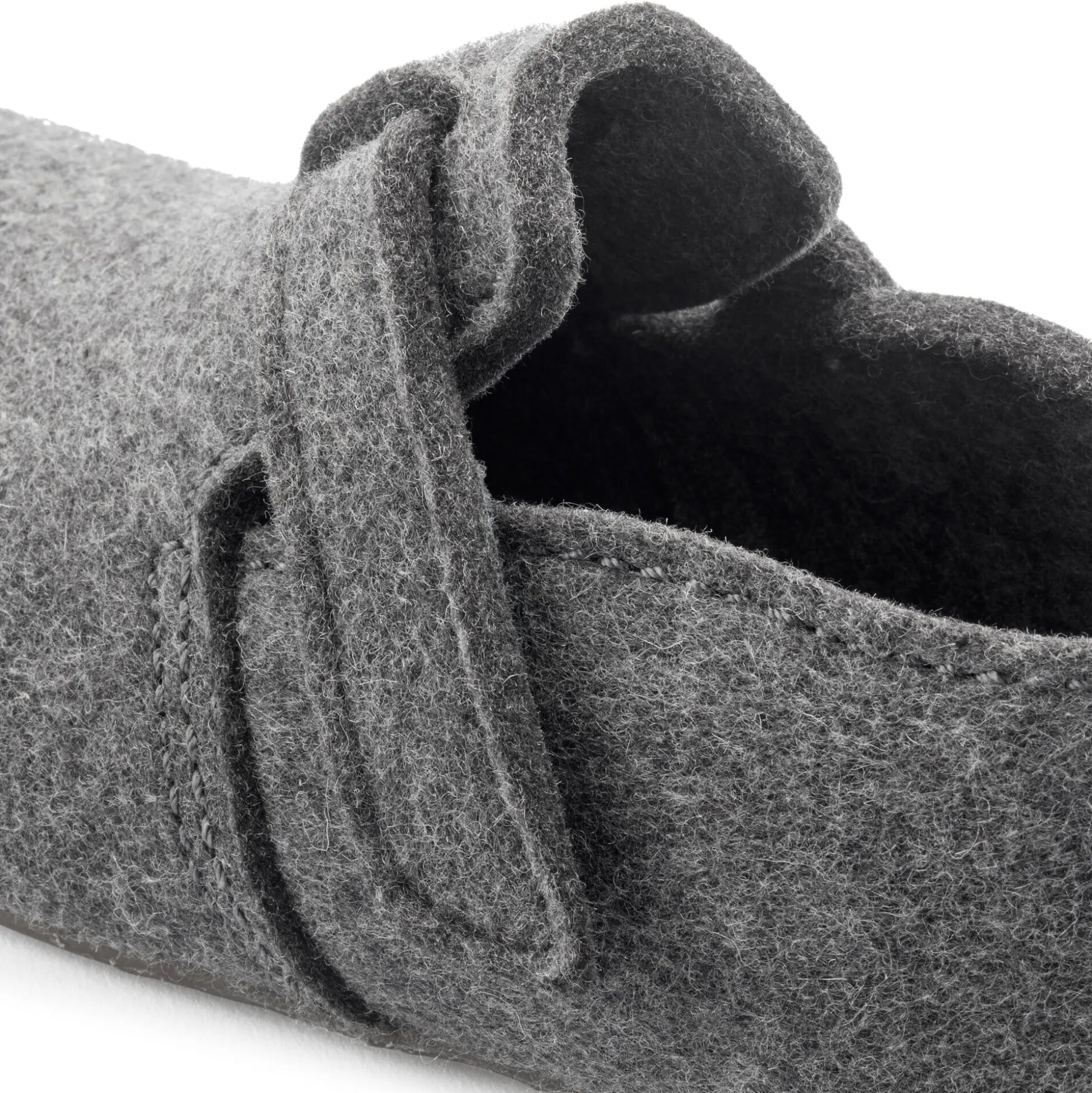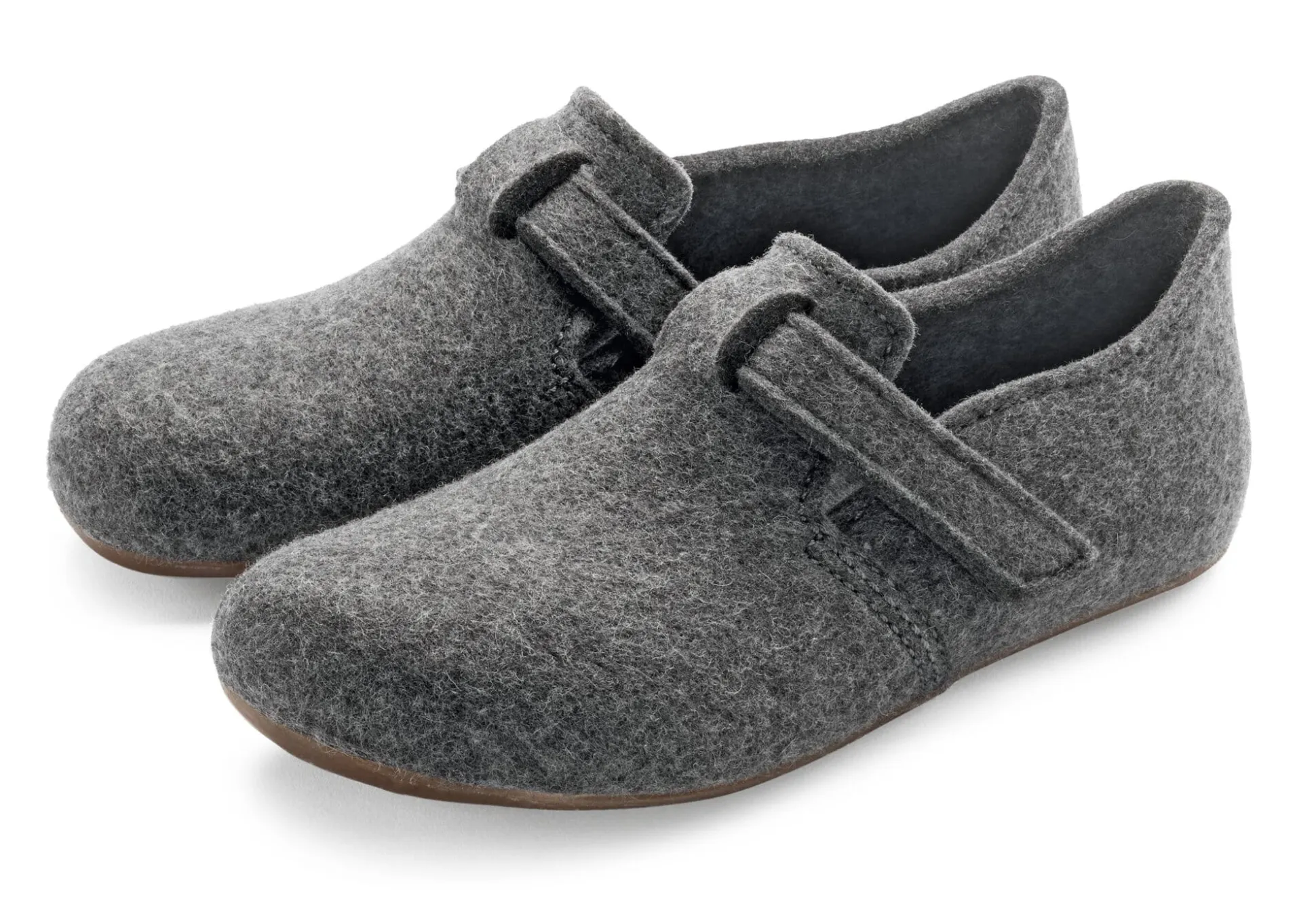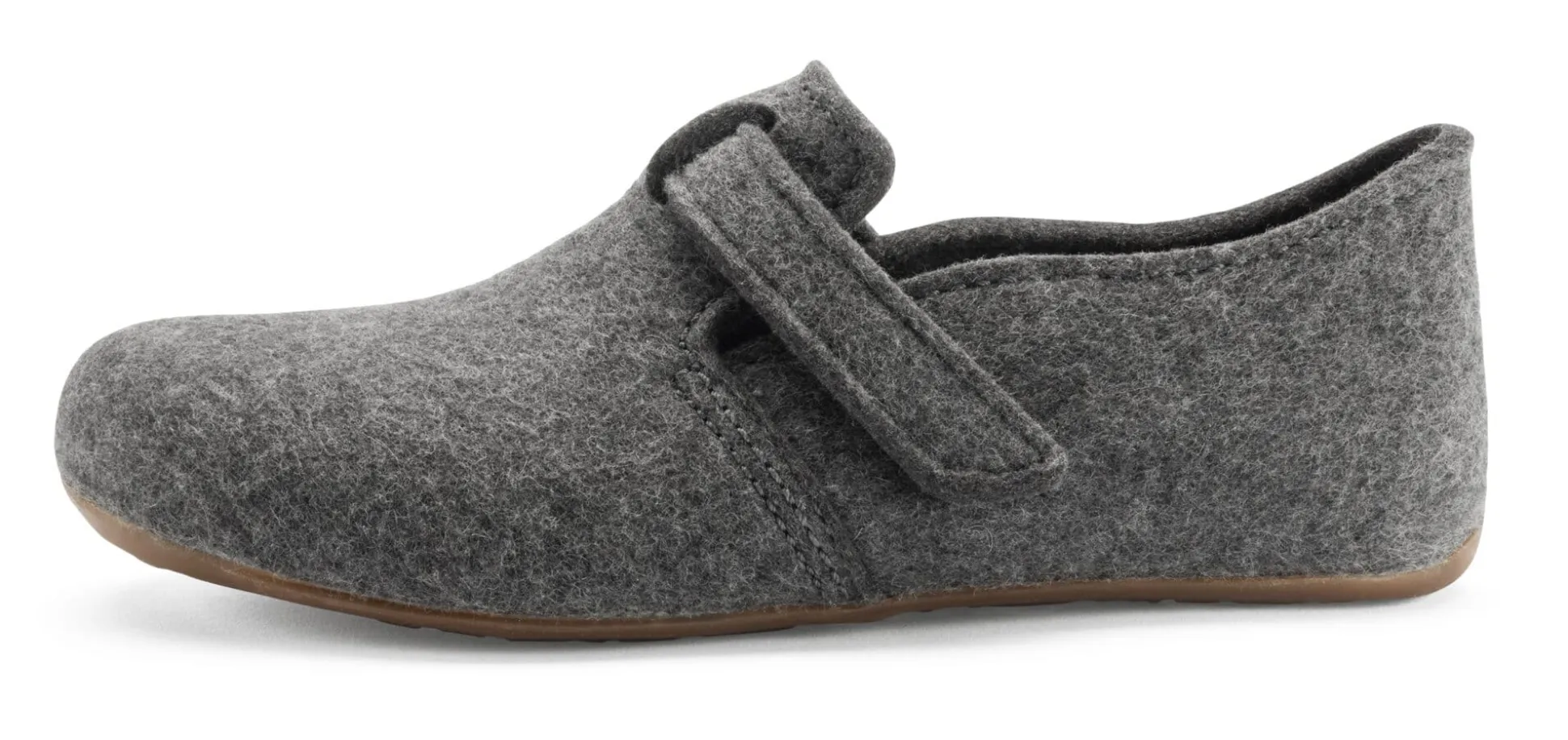 Fußumschließender Hausschuh aus Wollfilz. Ein angenähter Riemen mit Klettverschluss erlaubt die Weitenanpassung auf dem Spann und sorgt so für guten Sitz am Fuß. Die herausnehmbare Innensohle mit Kork-Latex-Fußbett gibt guten Halt; in Verbindung mit der Gummilaufsohle ist angenehmes und sicheres Laufen garantiert.