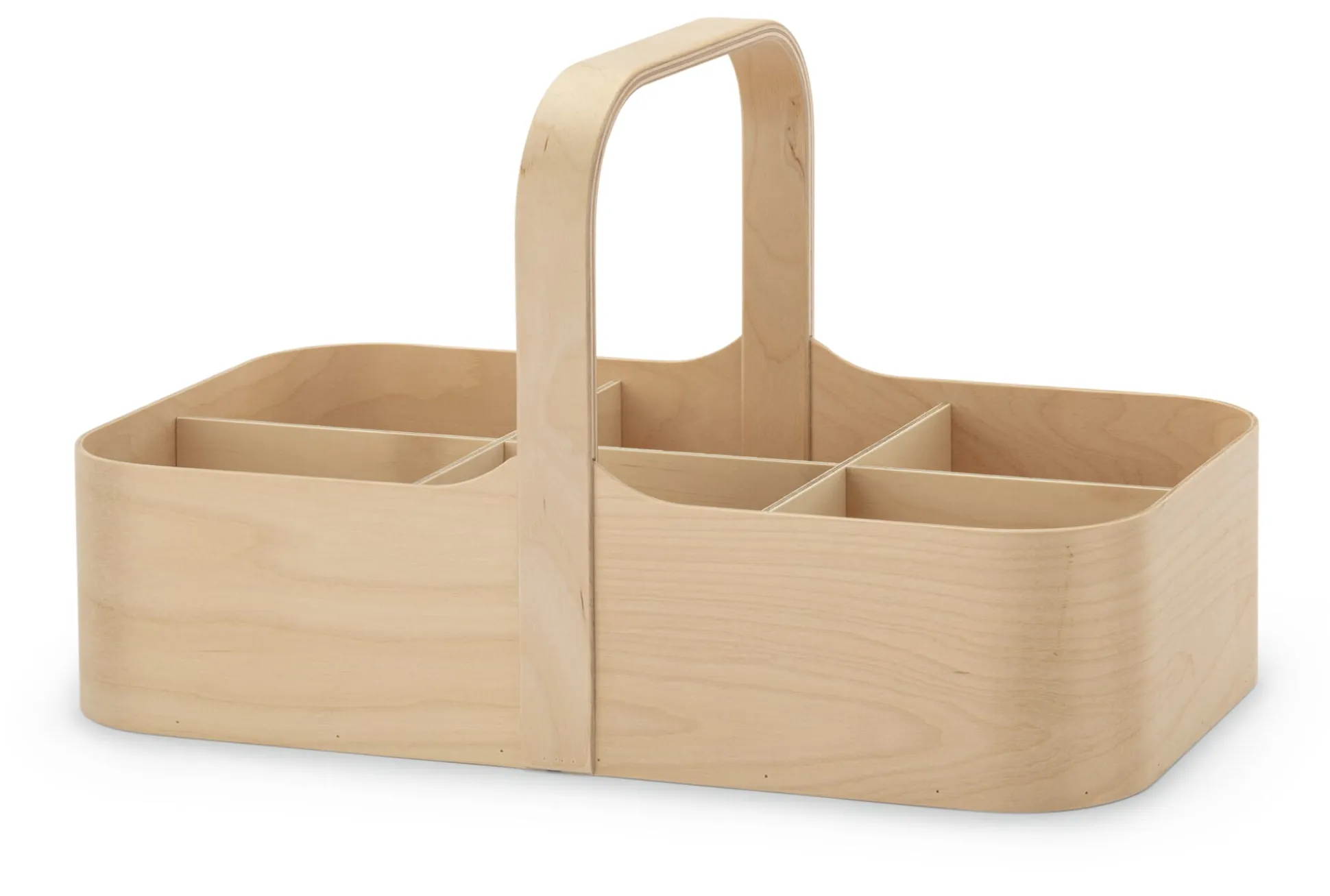 Birkensperrholz mit Einsatz (Herkunft Finnland). Hergestellt in Finnland. L 20 × B 37 × H 9,5 (mit Griff 22 cm). Einsatz zur Unterteilung in 6 Fächer à 10 × 12 cm. Gesamtvolumen 7 l. Gewicht 755 g.