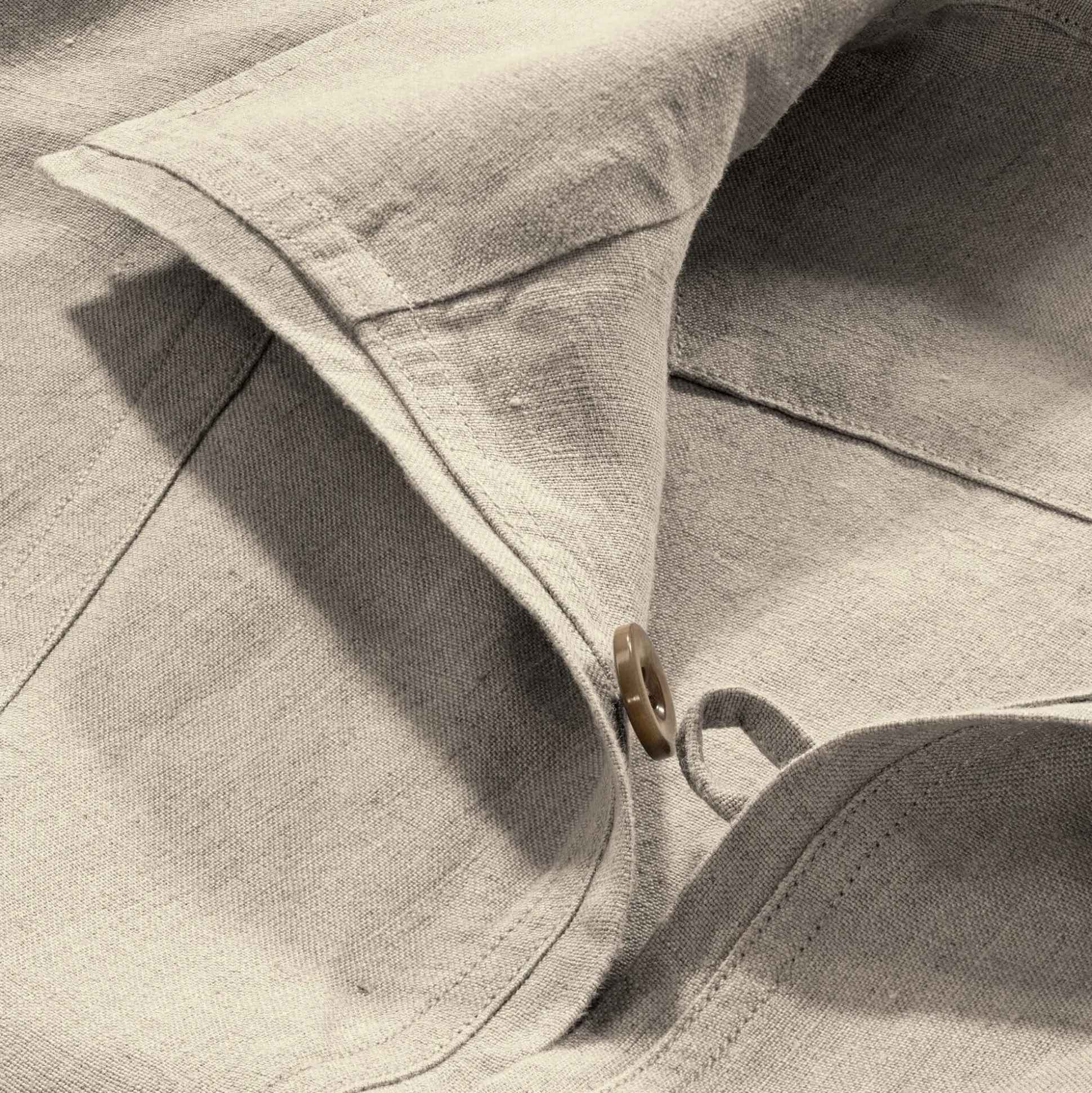 Ein ursprüngliches Fischerhemd in klassischer Form mit durchdachten Details: Um bei der Arbeit nirgendwo hängenzubleiben, hat es keine vorstehenden Knöpfe. Der Knopf für den Halsausschnitt liegt innen, die aufgesetzte Brusttasche ebenfalls. Wir lassen es aus flämischem Leinen mit einer für Hemden ungewöhnlich schweren Qualität konfektionieren.