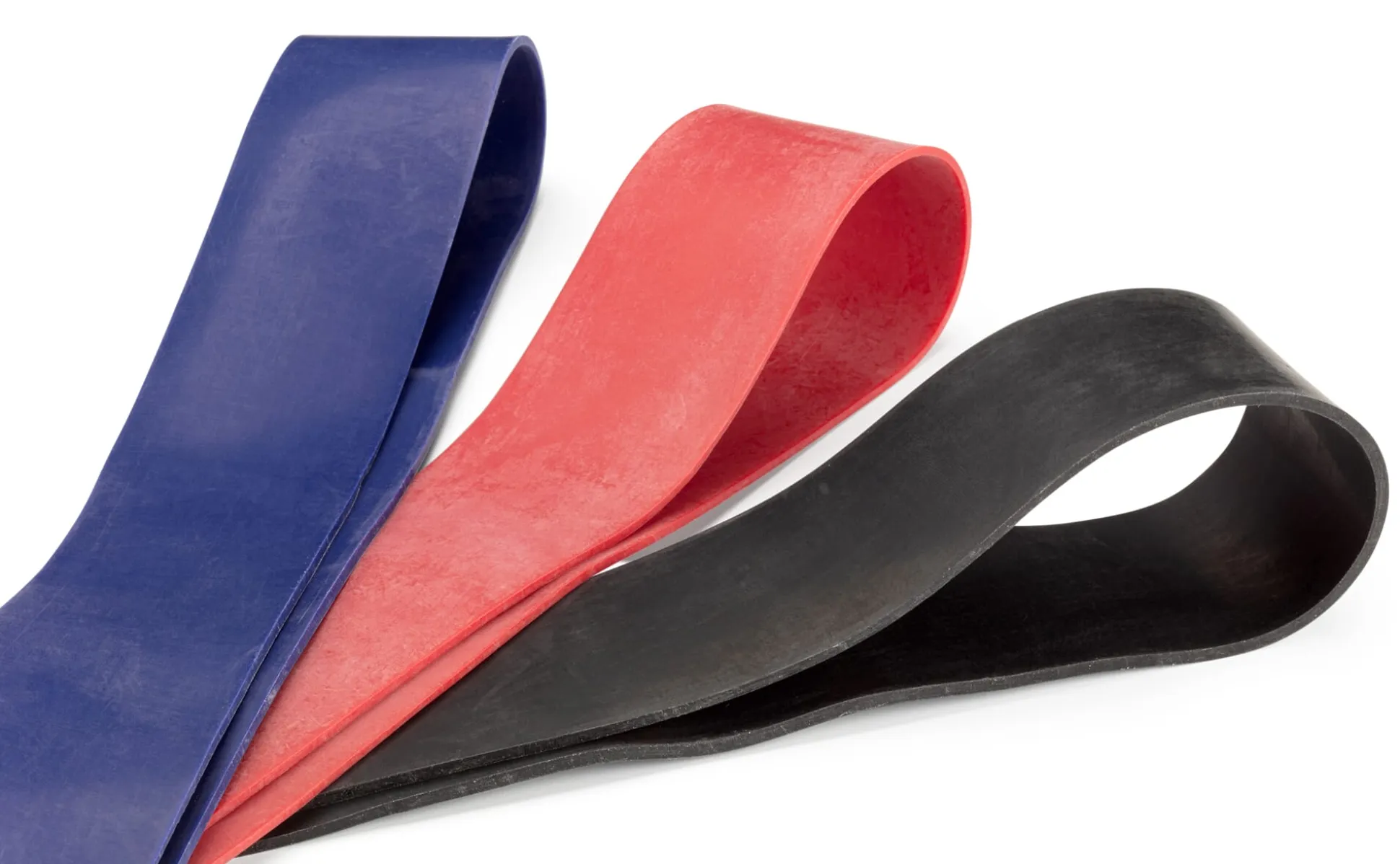 Fitnessloops aus 100% Naturkautschuk, Herkunft Sri Lanka. Je ein Fitnessloop der Stärke 1 mm (in Rot), 1,3 mm (Blau) und 1,6 mm (Schwarz). Hergestellt in Sri Lanka. 32 × 3 cm. Gesamtgewicht 270 g.