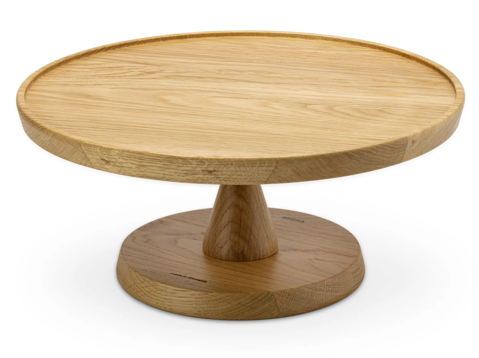Konditorei und Holzverarbeitung haben eines gemeinsam: Beide sind ein Traditionshandwerk. Was liegt da näher, als sie bei Tisch und auf der Kaffeetafel zusammenzuführen? Servieren Sie in der hauseigenen Konditoreiwerkstatt – mit anderen Worten, in Ihrer Küche – selbst gebackene Schwarzwälder Kirsch, Sachertorte, Marzipan-Torte, Mokka-Sahne-Torte, Frankfurter Kranz, Bienenstich oder vielleicht auch Dresdner Eierschecke stilvoll auf diesem Tortenständer aus geöltem Eichenholz. Das schöne Teil kommt als Bausatz zu Ihnen. Dieser besteht aus zwei Tabletts – einem mit großem und einem mit etwas kleinerem Durchmesser – und einem erhöhten Fuß, und alle drei Teile lassen sich ganz einfach miteinander verschrauben. So haben Sie die Wahl: Ob der Tortenständer auf großem oder kleinem Fuße stehen soll, entscheiden Sie schlicht und einfach nach dem Format des Backwerks, das Sie in Szene setzen möchten.