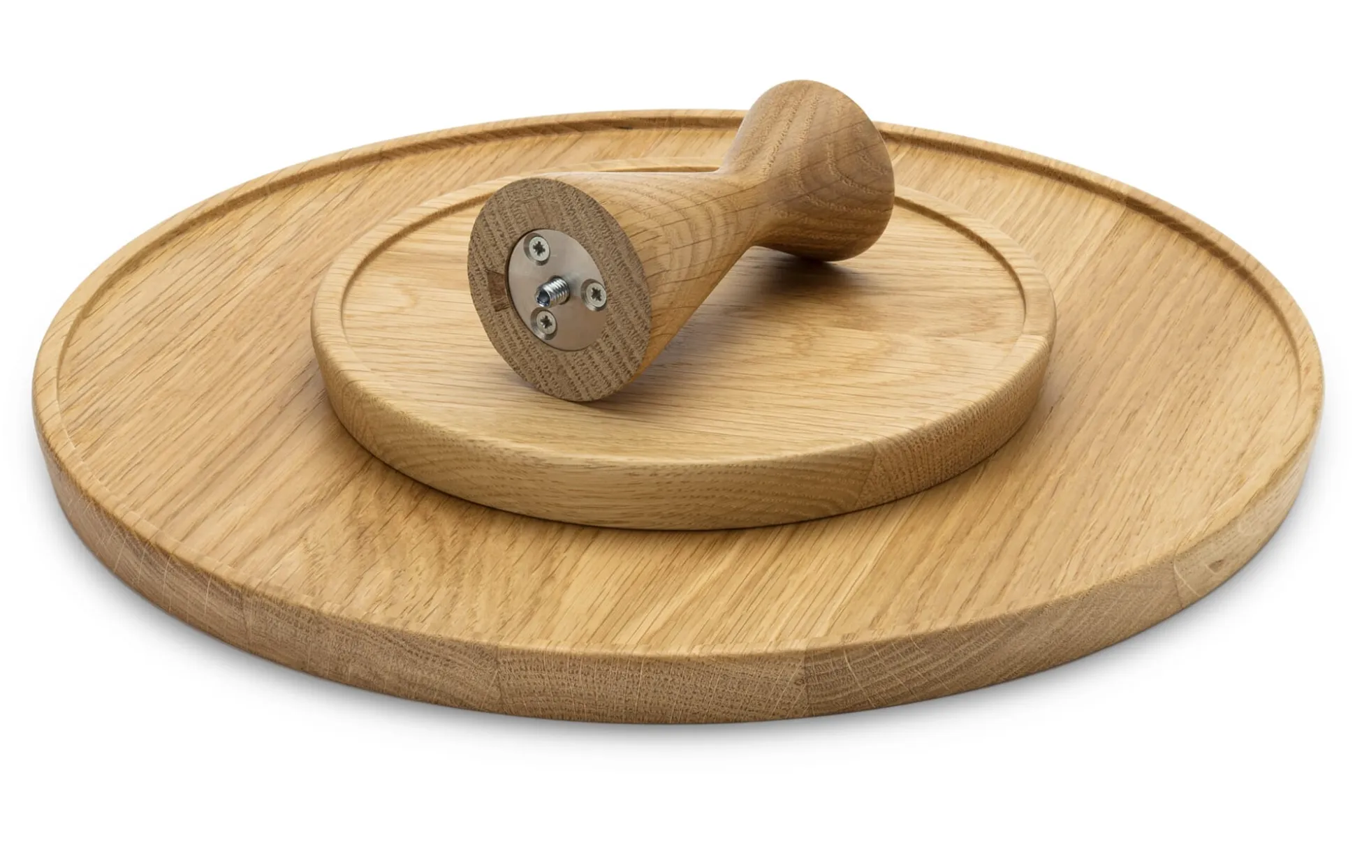 Eichenholz geölt. Ø oben 31 cm, Ø unten 17,5 cm. Höhe 14 cm. Gewicht 1,2 kg. Hergestellt in Slowenien.