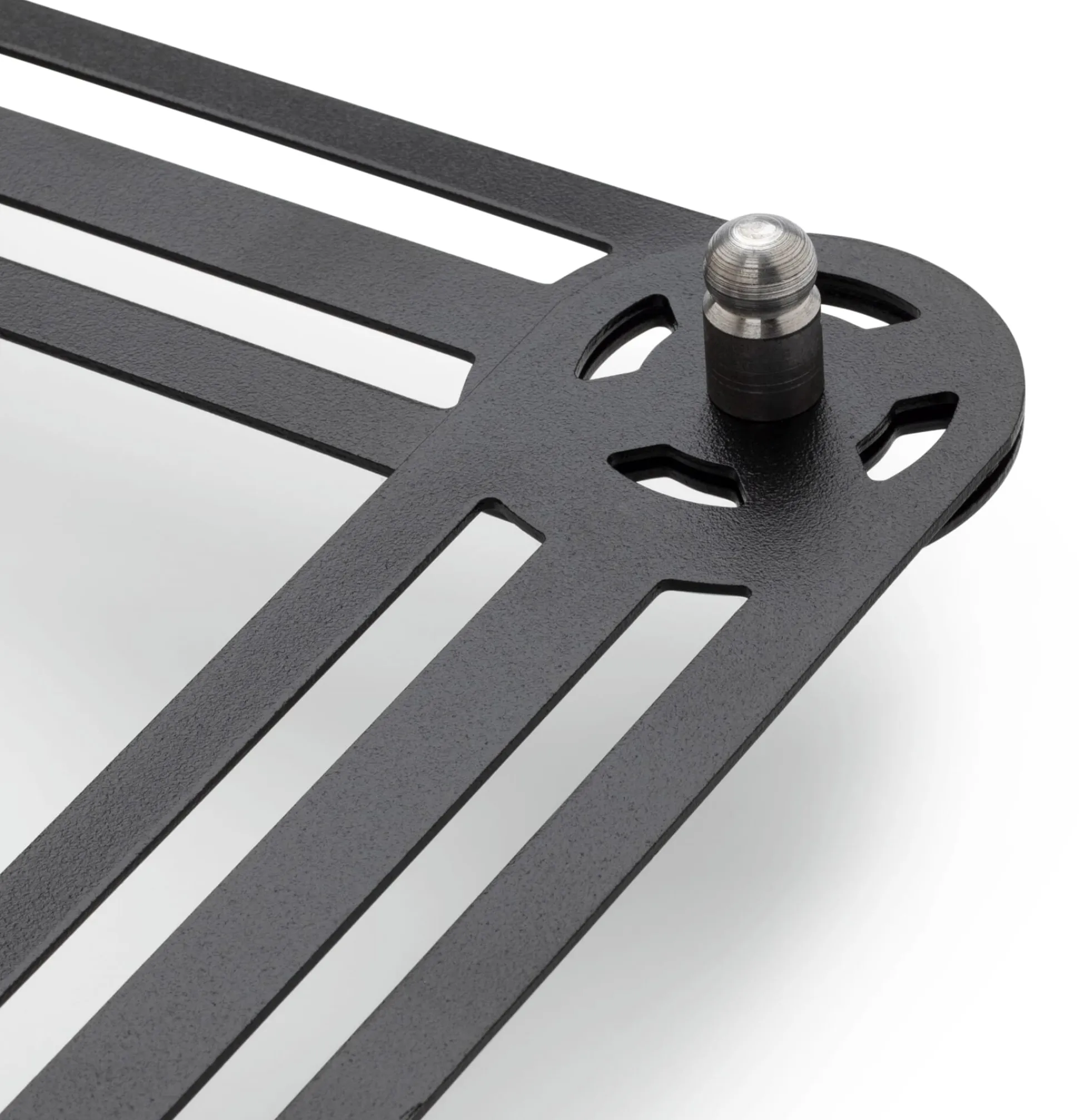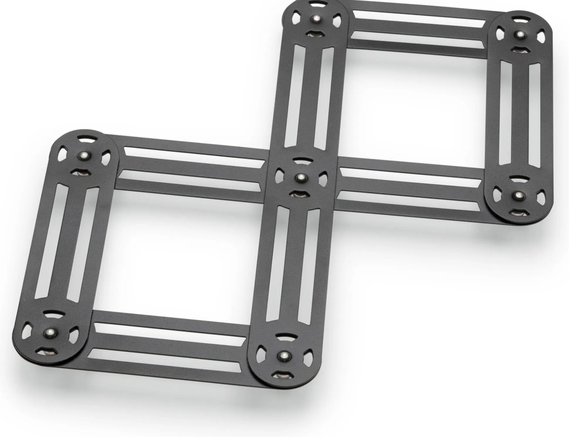 Knifflig bei einem Scherengitteruntersetzer ist natürlich das Gelenk – oder vielmehr die Gelenke, bei unserem Untersetzer sind es sieben an der Zahl. So ein Gelenk soll leichtgängig, dabei verschleißfest sein und nicht auftragen. Wie bei einer Schere ermöglicht es die bewegliche Verbindung von zwei Schenkeln, die sich schließen lassen oder weit bis zum „X“ geöffnet werden können. In der Kombination von zwei oder drei Gelenken auf einem Schenkel entsteht das ziehharmonikaartige Gitter, das sich nach Bedarf auseinanderziehen oder zusammenschieben lässt. Auf der Oberseite ist davon nur die runde Kuppe des Stifts zu sehen, der jeweils den Zusammenhalt gewährleistet. Auf der Unterseite ist der Stift pfiffigerweise zum Fuß ausgebildet. Damit steht der Untersetzer sicher auf seinen sieben Füßen mit bewährtem Abstand zur Unterlage. Wo immer Sie ihn hinstellen, schützt er das Holz der Arbeits- oder Tischplatte, die Leinendecke der feinen Tafel wie die Keramikfliesen des Balkontischs vor der Hitze von Pfanne, Topf und Auflaufform.