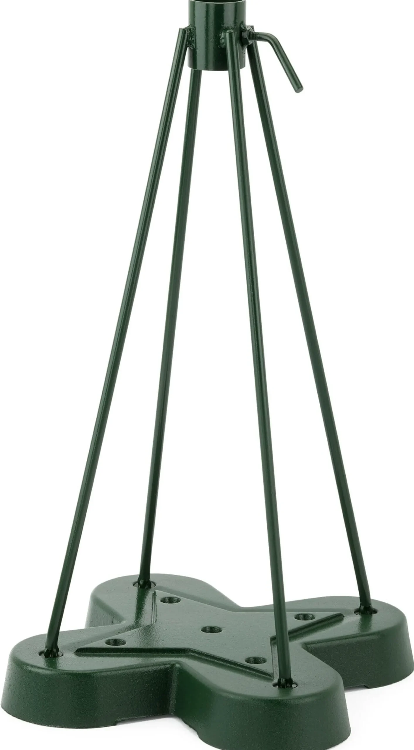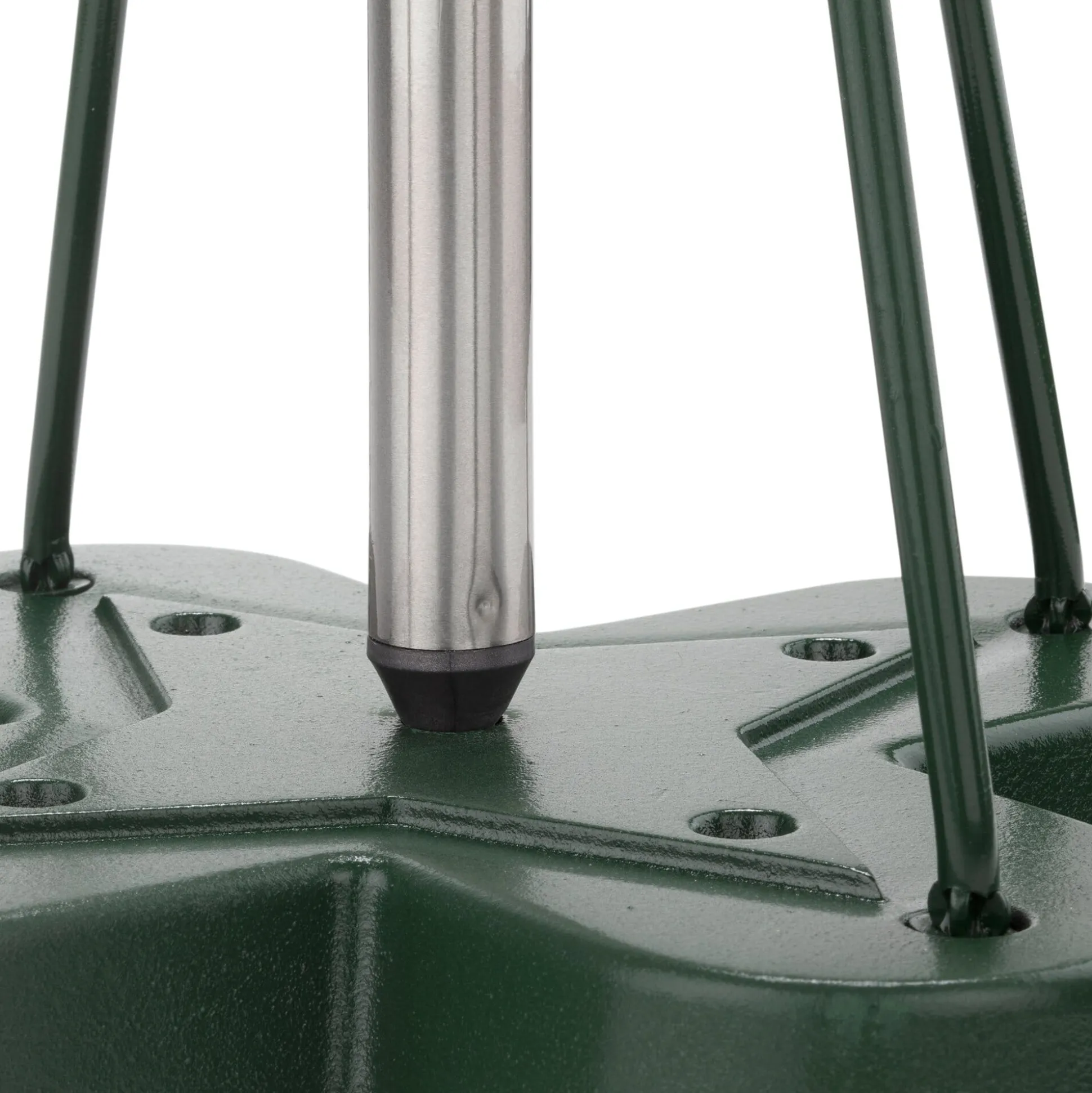 Fuß Gusseisen grün lackiert. Gestänge Stahl grün lackiert. Für Schirmmasten bis max. 4 cm Ø. Höhe 60 cm, Standfläche 36 × 36 cm. Gewicht 9,7 kg. Beachten Sie bitte: Eisenguss kann rosten. Dass insbesondere in den Haltelöchern mit der Zeit kleinere Roststellen entstehen, ist daher nichts Ungewöhnliches.