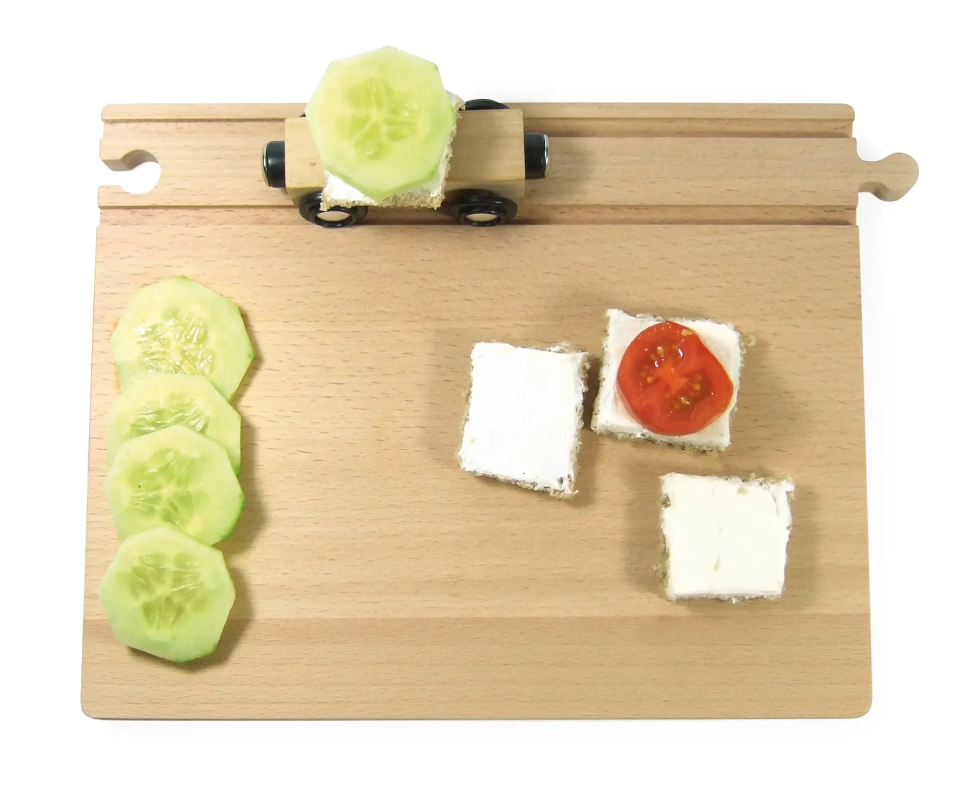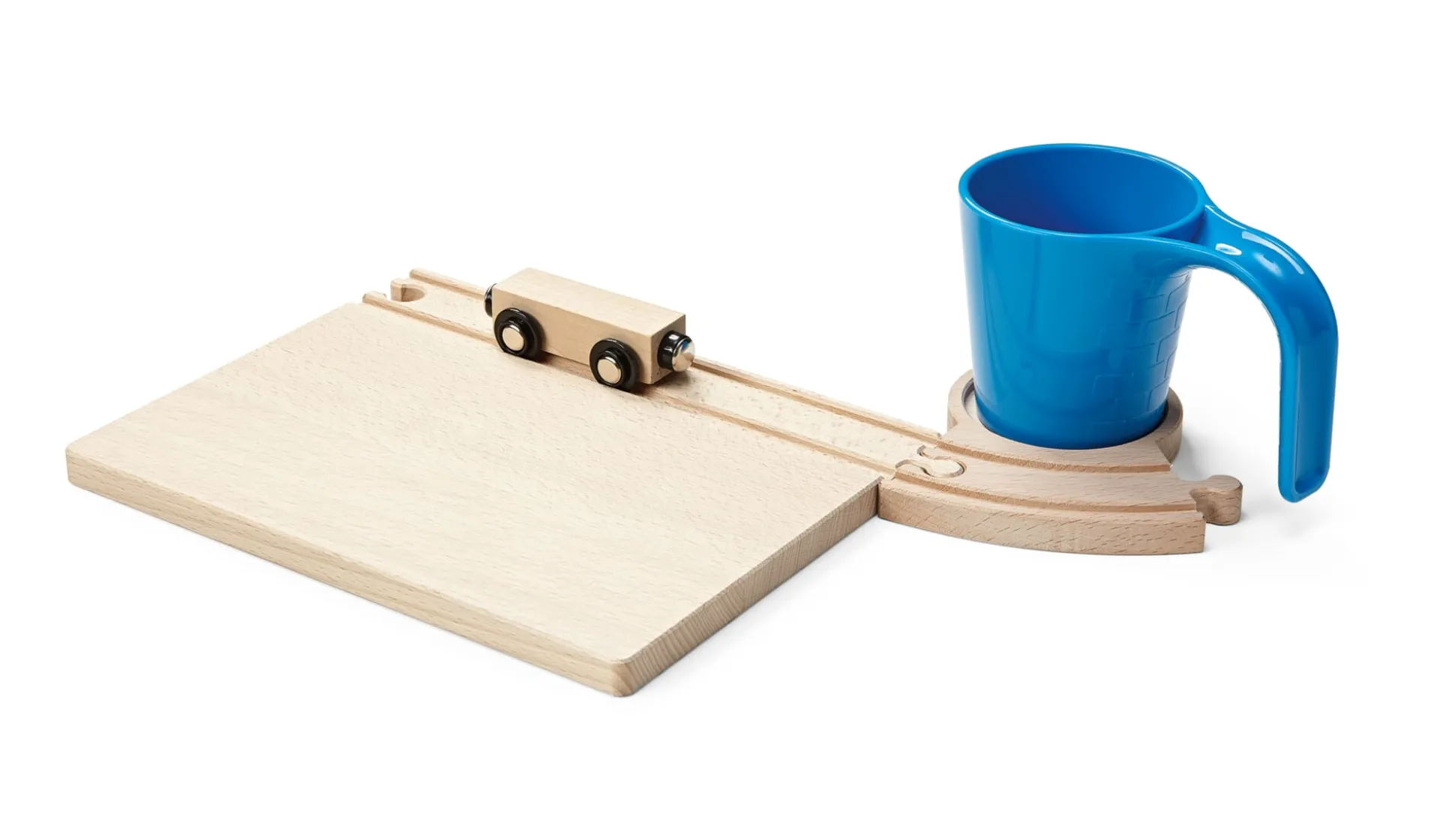 Liebevoll und fantasiereich: Untersetzer, Tunneltasse und klassische Holzeisenbahn, alles am Frühstücksbrettchen aus Buchenholz und mit passendem Anschluss an die Gleise bekannter Marken. Gleiches gilt auch für den Untersetzer, der zudem eine 45° Kurve integriert hat.
