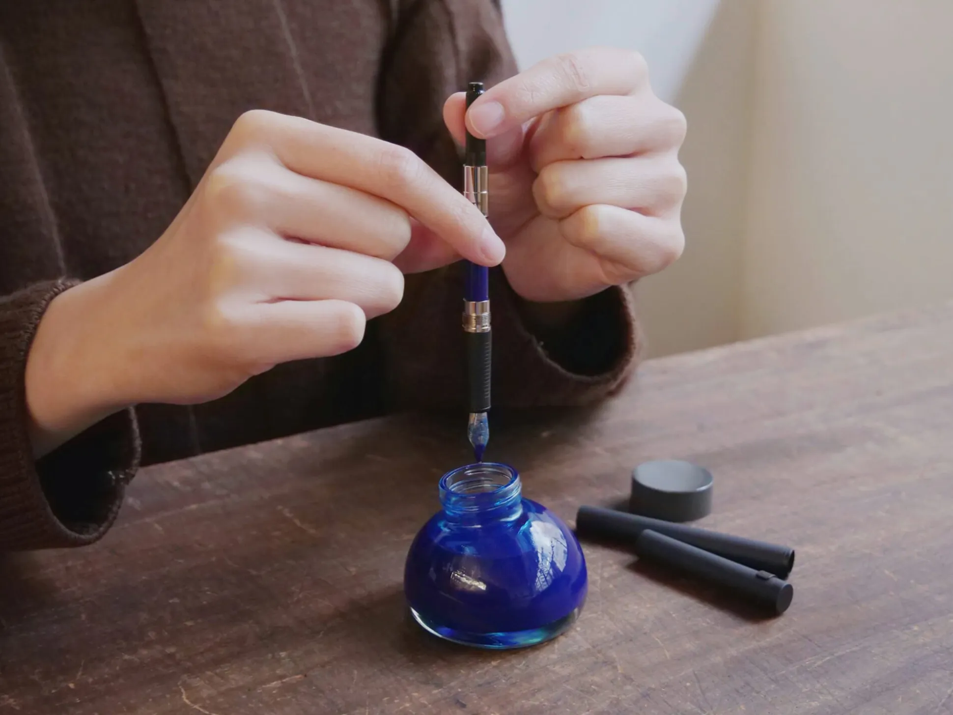 Der Füllfederhalter KAKIMORI, handgefertigt in Japan, besticht durch sein schlankes, minimalistisches Design und sein langlebiges mattschwarzes Aluminiumgehäuse. Mit präziser Edelstahlfeder in feiner oder mittlerer Ausführung füllt er zuverlässig Briefe, Notiz- und Tagebücher.