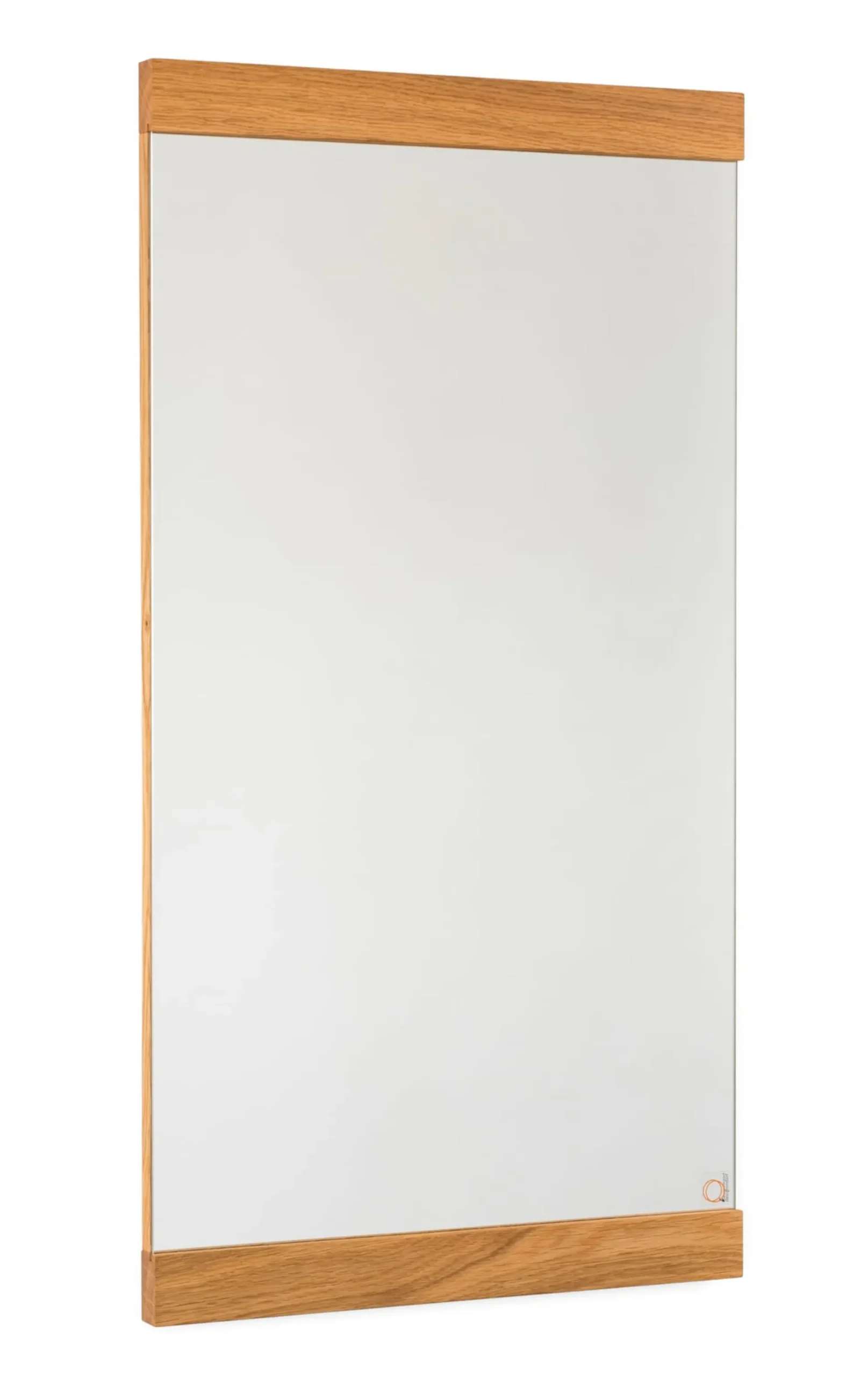 Spiegelglas, Leisten aus geöltem Eichenholz (Herkunft Deutschland). Rückseitig mit zwei Schlüsselloch-Aufhängern aus Metall. Höhe 70,5 cm, Breite 37,5 cm, Tiefe 2 cm. Gewicht 2,6 kg. Schrauben und Dübel liegen bei.