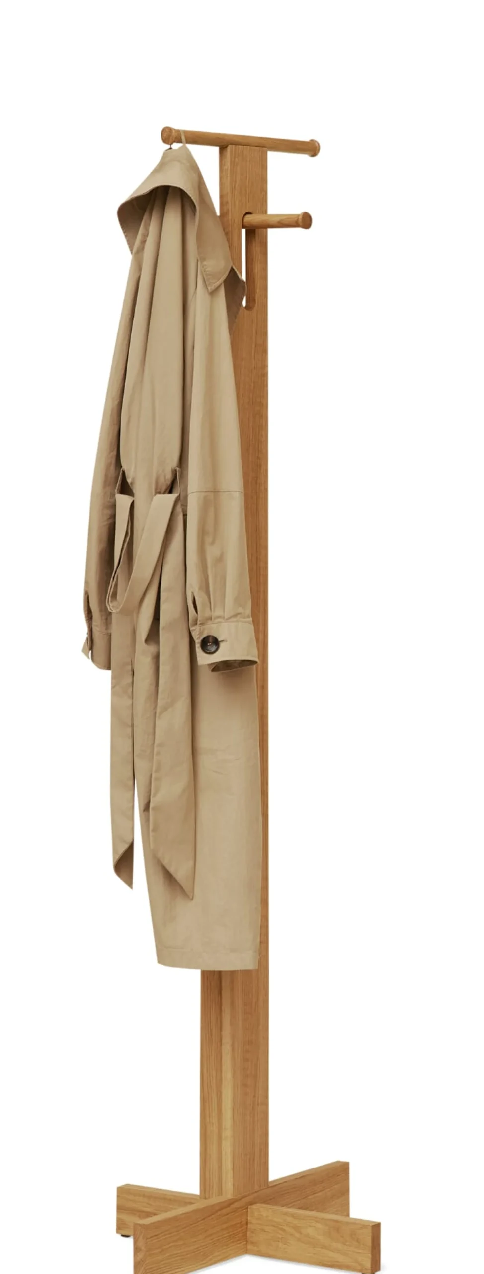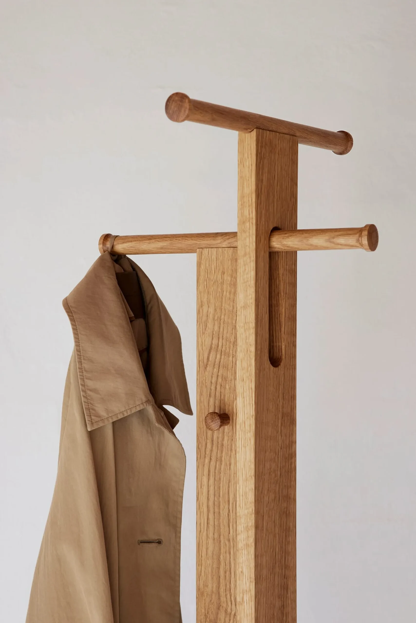 Diele, Bad oder Schlafzimmer: So stilvoll wie platzsparend wahrt dieser Garderobenständer selbst in einer kleinen Nische Ordnung. Auf schlankem Fuß emporragend, ist sein Design auffallend puristisch und filigran, dabei sorgen das massive, geölte Eichenholz und die intelligente Konstruktion für standhafte Tragfähigkeit.