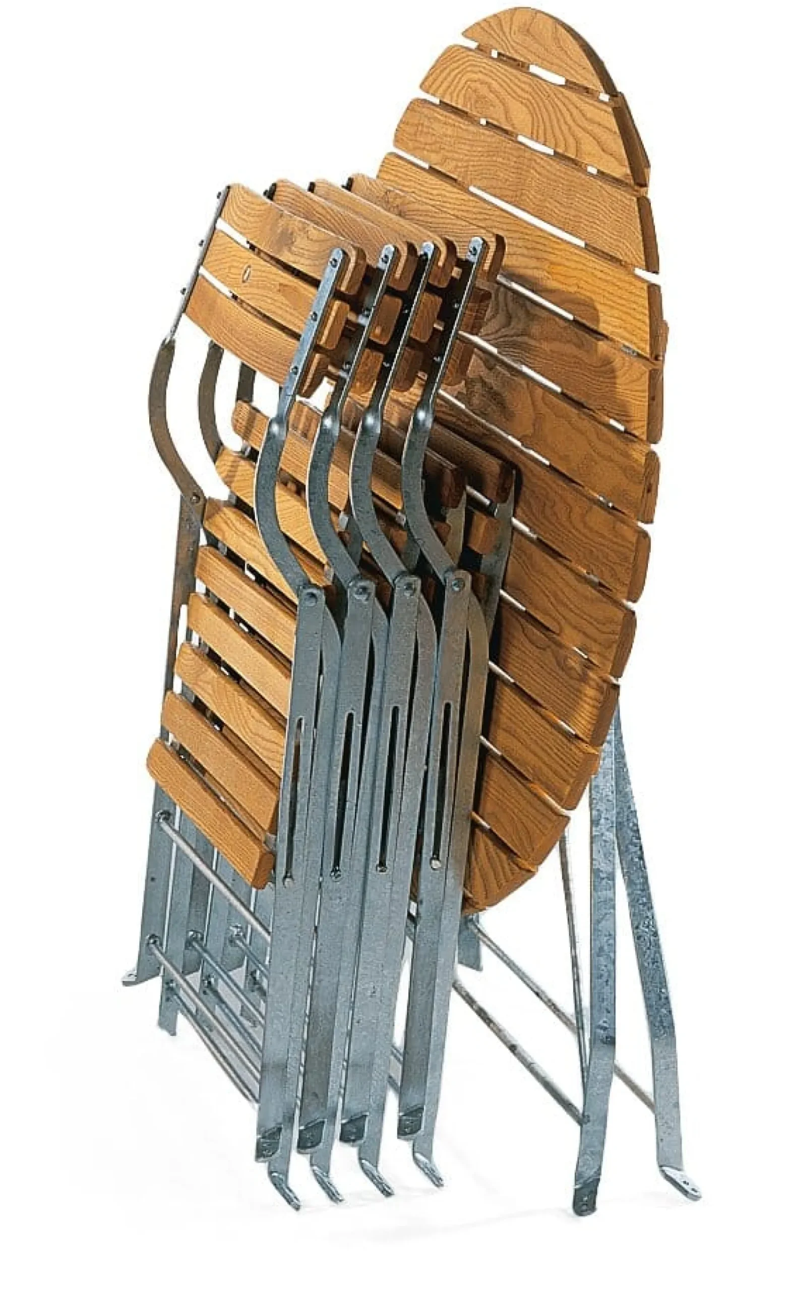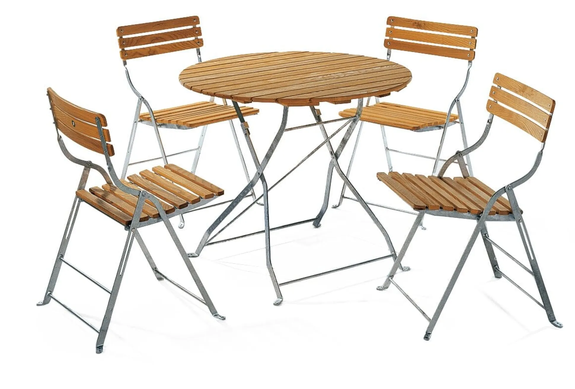 Vier Stühle, Bandstahl feuerverzinkt, Robinienholz geölt, Kunststoffnoppen. Höhe 79 cm, Breite 46 cm, Tiefe 52 cm. Sitzfläche 39 × 39 cm, Sitzhöhe 45 cm. Klapp- und stapelbar, Klappmaße 91,5 × 46 × 15 cm. Gewicht 7,3 kg. Ein Tisch, Bandstahl feuerverzinkt, Robinienholz geölt, Kunststoffnoppen. Ø 90 cm, Höhe 74 cm. Klappmaße 110 × 90 × 27 cm. Gewicht 15 kg.