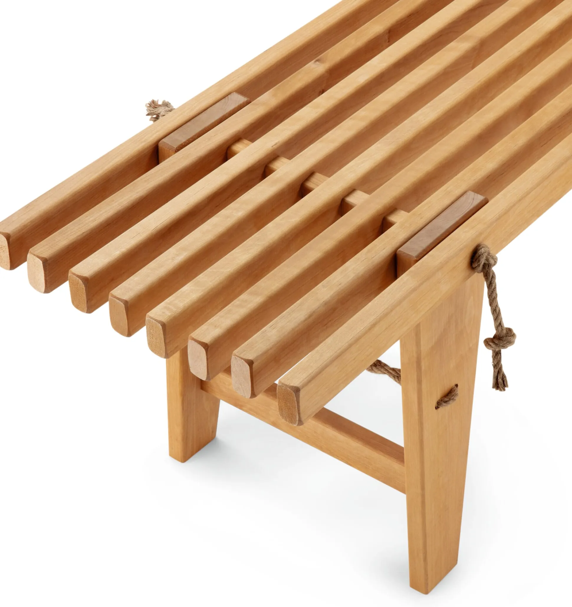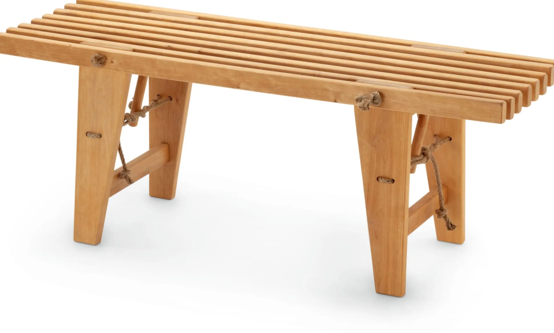Durchaus mehr als außentauglich, fügt sich diese schlichte Bank aus Erlenholz, falls Gäste in größerer Zahl erwartet werden, als Ergänzung oder als Reserve sogar im Esszimmer unauffällig ein. Der Zusammenbau des einfachen Möbels gelingt leicht, da nicht einmal Werkzeug benötigt wird. Die Konstruktion aus Liegeleisten, Querbalken und Füßen erfährt Halt durch die beiden Hanfseile. Mithilfe der beiliegenden Festzurrer können diese Seile mehr oder weniger straff gespannt werden – sehr fest bei ebenem Untergrund und eher locker, wenn Unebenheiten wie auf der Wiese auszugleichen sind. Erlenholz beweist seine Ausdauer sonst zumeist in Unterwasser-Holzkonstruktionen, etwa in Form von Stützpfählen. Für die Gartenbank wird das dauerhafte Holz zusätzlich mit einem Pflegeöl vorbehandelt: Eine Maßnahme, die Sie in regelmäßigen Abständen wiederholen können, um seine Haltbarkeit noch zu verlängern und es auch optisch aufzufrischen. Tipp: die Oberflächen vorher gründlich säubern.