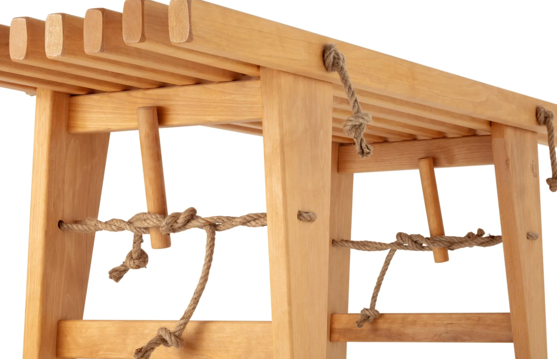 Erlenholz (Herkunft Estland) geölt. Seile aus Hanf. Hergestellt in Estland. Länge 120, Breite 37,5 cm, Höhe 45 cm. Gewicht 9,6 kg. Belastungsgewicht max. 140 kg.