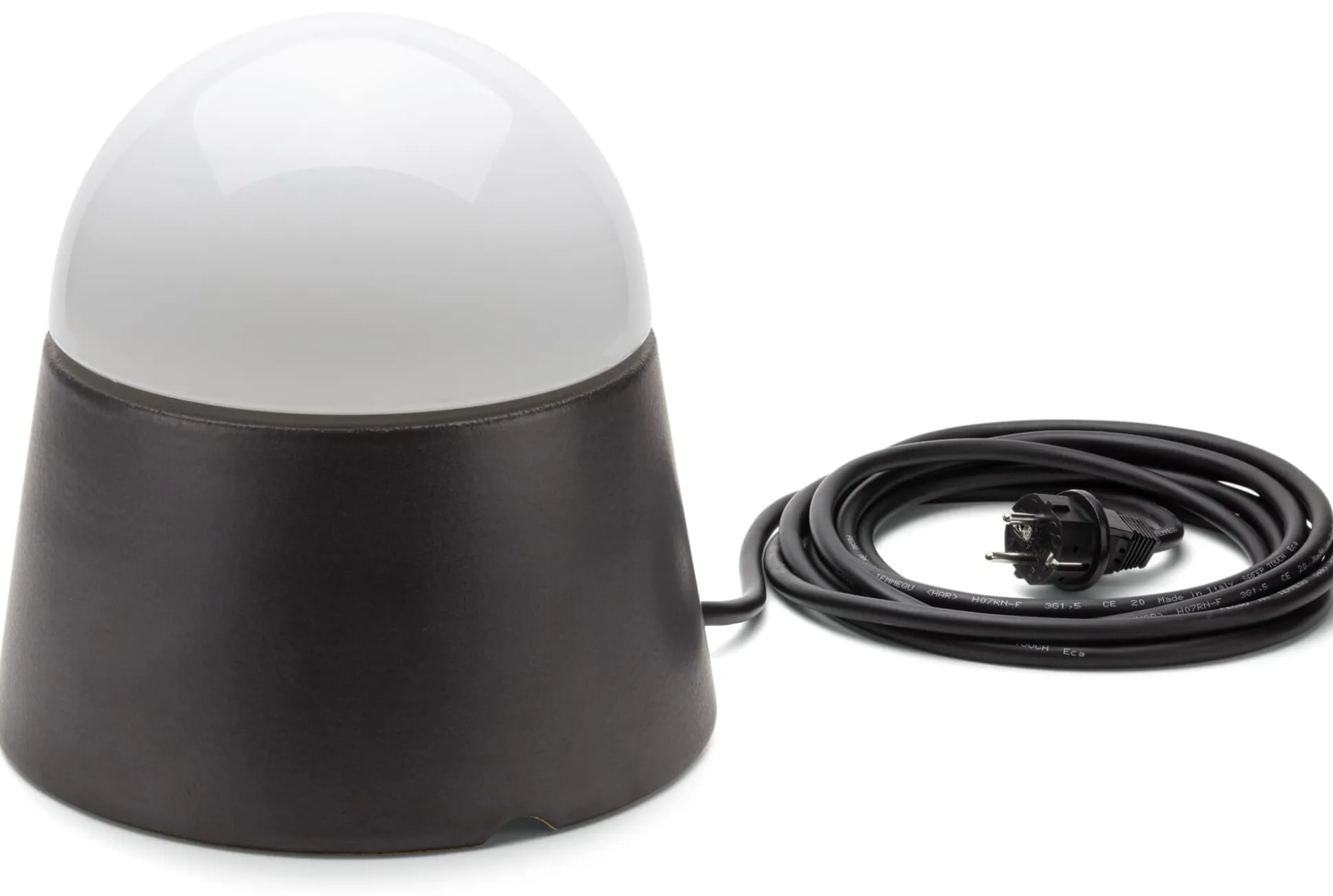 Eine Bodenleuchte mit einem Fuß aus frostfester, bei 1.250 °C gebrannter Keramik, auf dem eine Kuppel aus Opalglas sitzt. Die Leuchte besitzt ein 4,8 m langes Steckerkabel aus Gummi und eine wassergeschützte Steckdose im Fuß: So können mehrere Leuchten in Reihe geschaltet werden, und in der Funktion als mobile Außensteckdose lassen sich auch andere Geräte anschließen. Im Fuß der Leuchte befindet sich eine Aussparung für das Kabel, sodass dieser immer plan auf dem Boden steht.