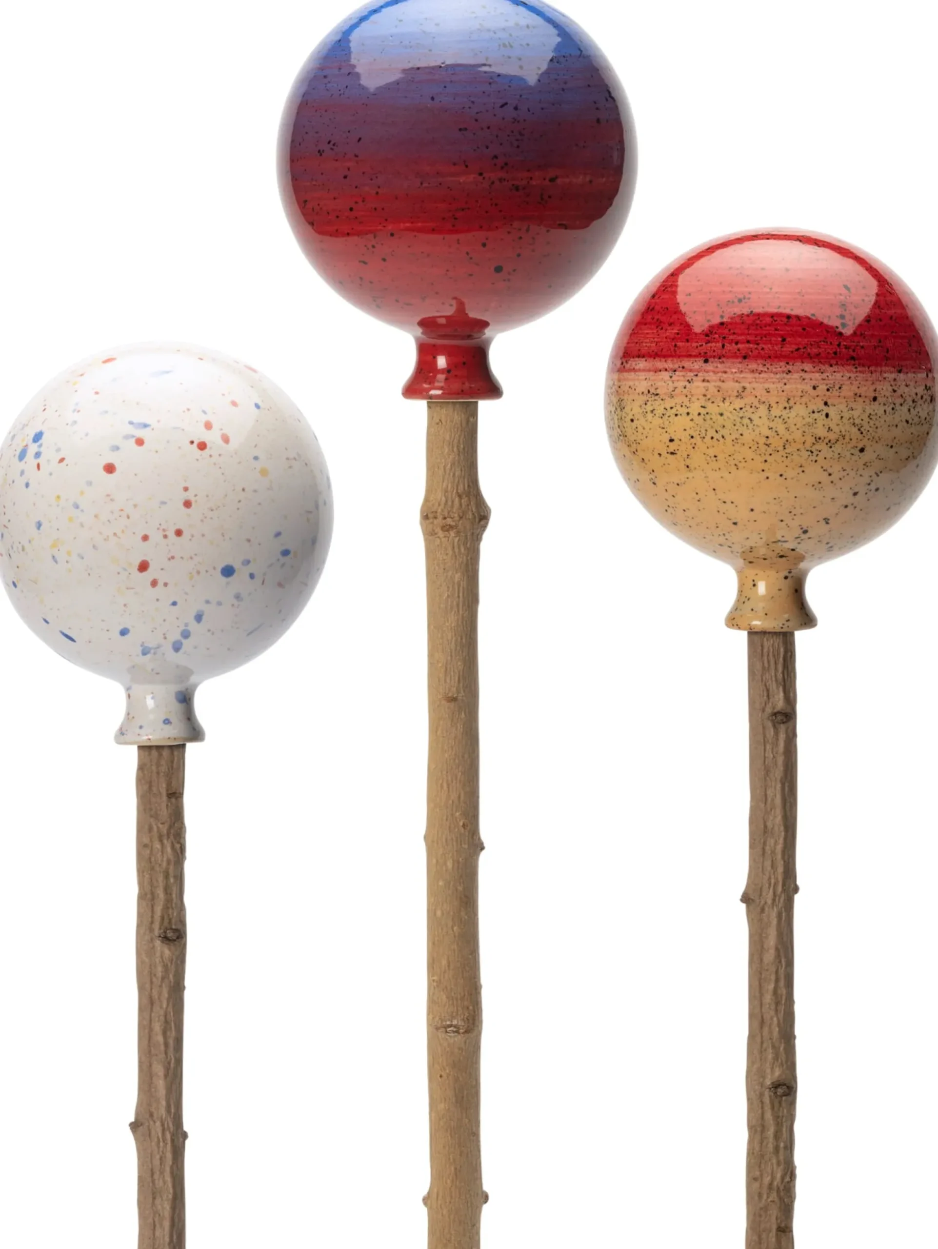 Gartenkugeln wie diese bestanden usprünglich aus reflektierend gefärbtem Glas und sollten vorrangig der Vogelabwehr dienen. Durchaus rustikaler, da weniger zart und zerbrechlich, sind unsere schönen, aus Keramik handgetöpferten und farbig glasierten Gartenkugeln. Der schmückende Charakter steht hier eindeutig im Vordergrund, denn mit ihrer leuchtend bunten Glasur setzen die Keramikkugeln (nicht nur) in der kalten Jahreszeit, wenn die Natur ruht, Tupfen in warmen Farben in Ihre Beete und Gefäße. Passende Stecken liefern wir nicht mit. Insbesondere im naturhaft gestalteten Garten stellen wir uns aber Haselruten oder andere selbst geschnittene Zweige entsprechenden Durchmessers als sehr geeignet vor.