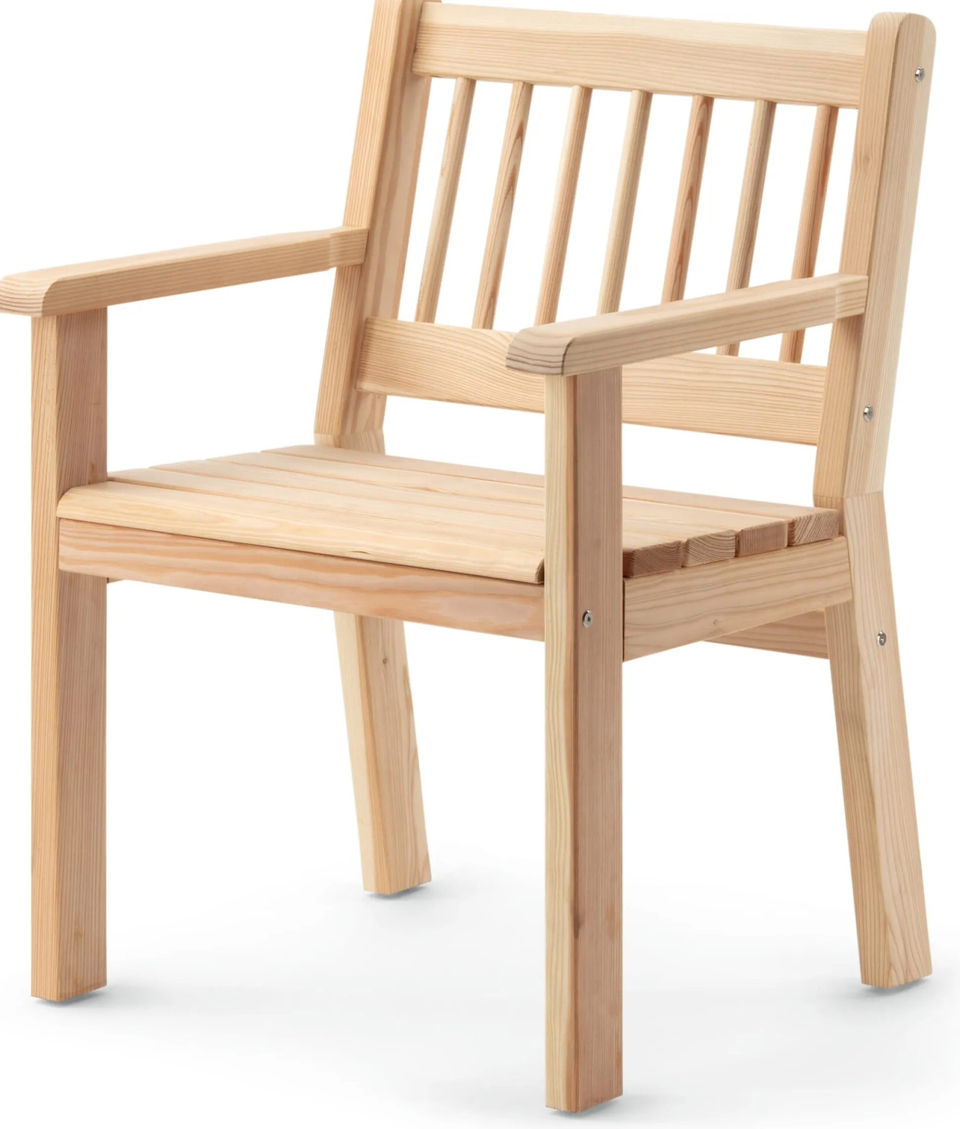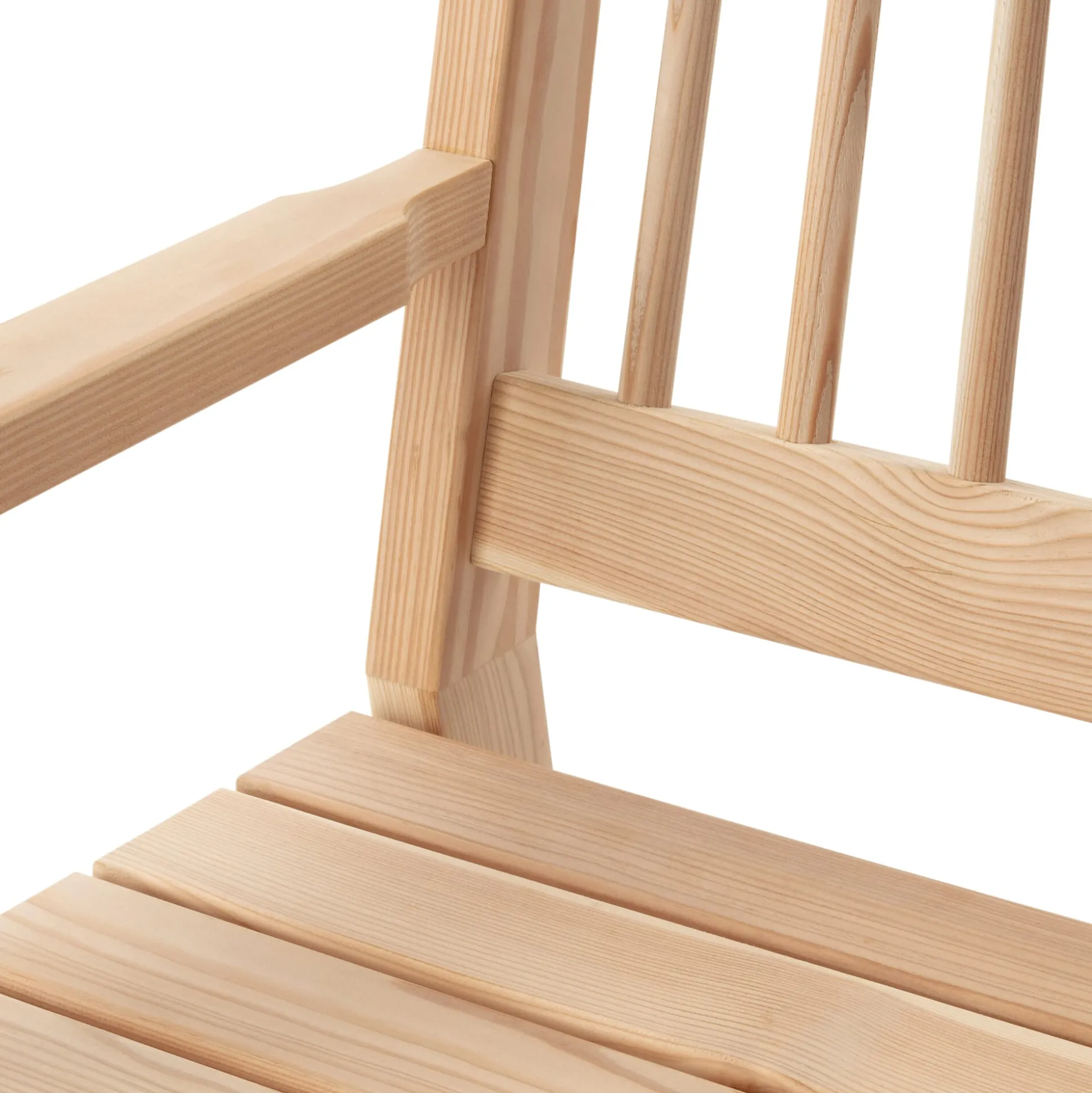 Lärchenholz unbehandelt (Herkunft Deutschland). Kunststoffschoner zum Schutz des Untergrundes. Sitzhöhe 47 cm, Sitzbreite 59,5 cm, Sitztiefe 40 cm. Breite der Armlehnen 6 cm. Gesamt Breite 62 cm, Tiefe 60 cm, Höhe 91,5 cm. Gewicht 14 kg.