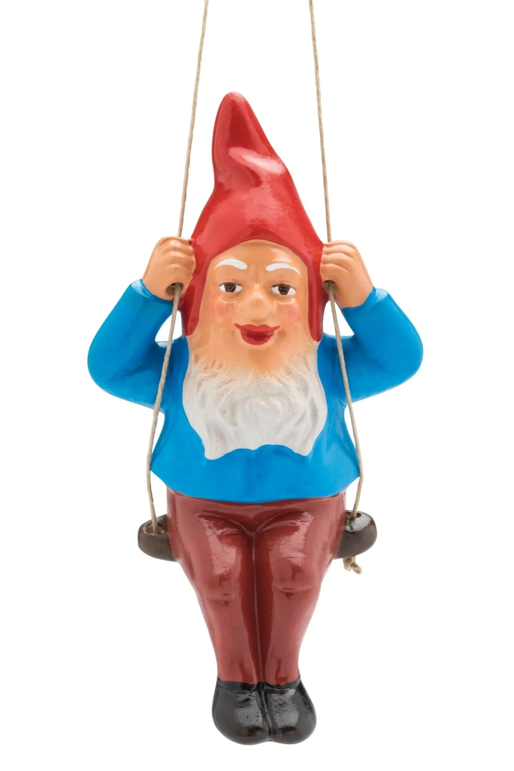 Dieser kleine, handbemalte Gartenzwerg, der fest auf seiner Schaukel hockt, lässt sich tatsächlich ins Schwingen versetzen – wenn man ihn an der stabilen Kordel in Baum oder Strauch oder vielleicht an einen Haken in der Laubenwand hängt. Den Dekorationsmöglichkeiten sind daher kaum Grenzen gesetzt.