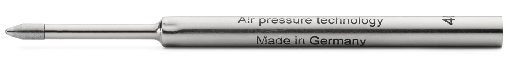 Eigens für den Taschenkugelschreiber Sterlingsilber produzierte Mine. Ihr hermetisch verschlossenes Überdrucksystem erlaubt das Schreiben in nahezu jeder erdenklichen Lage und Umgebung – auch dann, wenn ein schneller Wechsel zwischen oben und unten oder kalt und warm erfolgt. Strichstärke M.