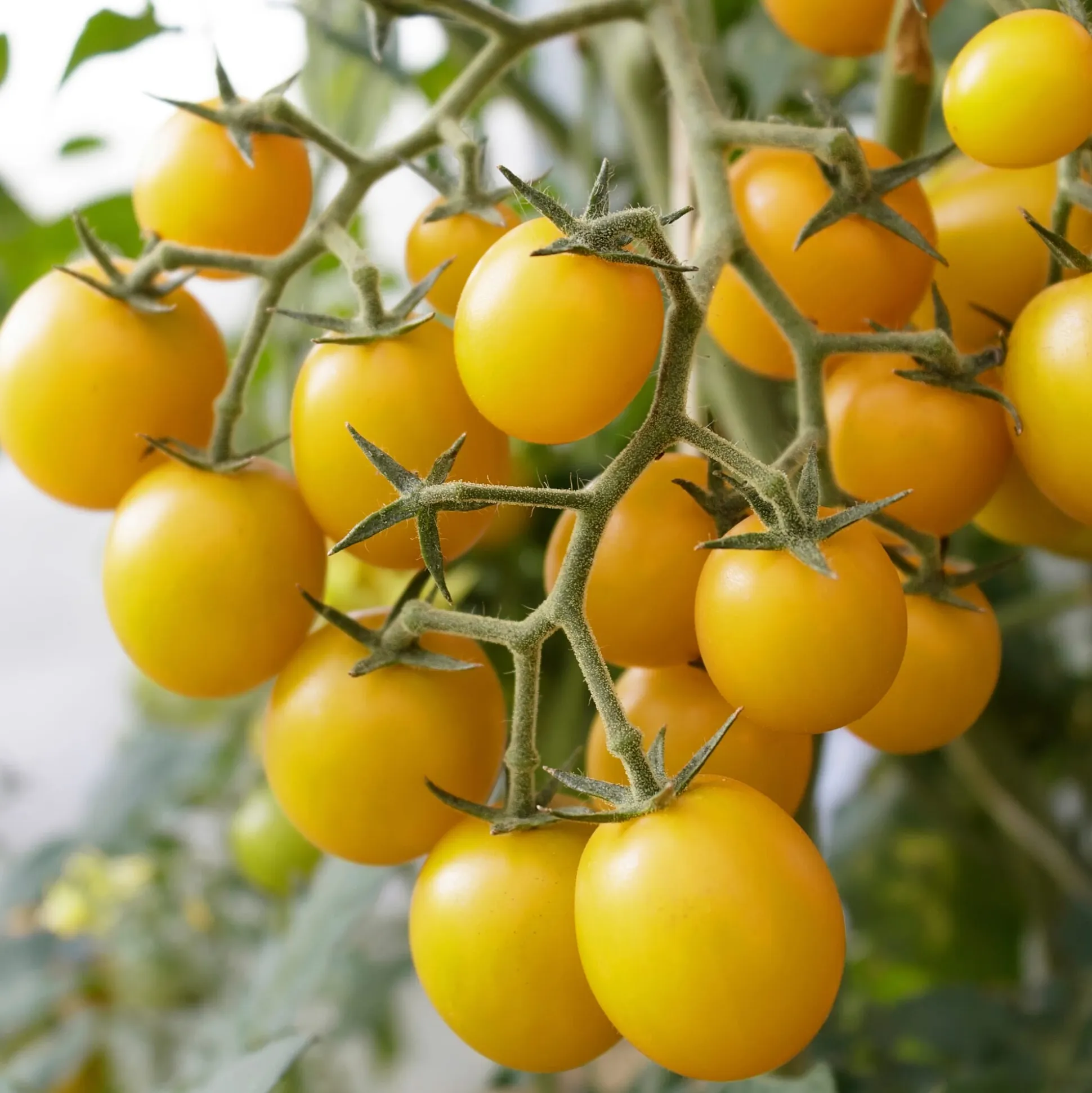 Kleine Buschtomate mit gelben, kirschgroßen, runden, süßen Früchten. Sehr reichtragend, nur knapp 20 cm hoch.