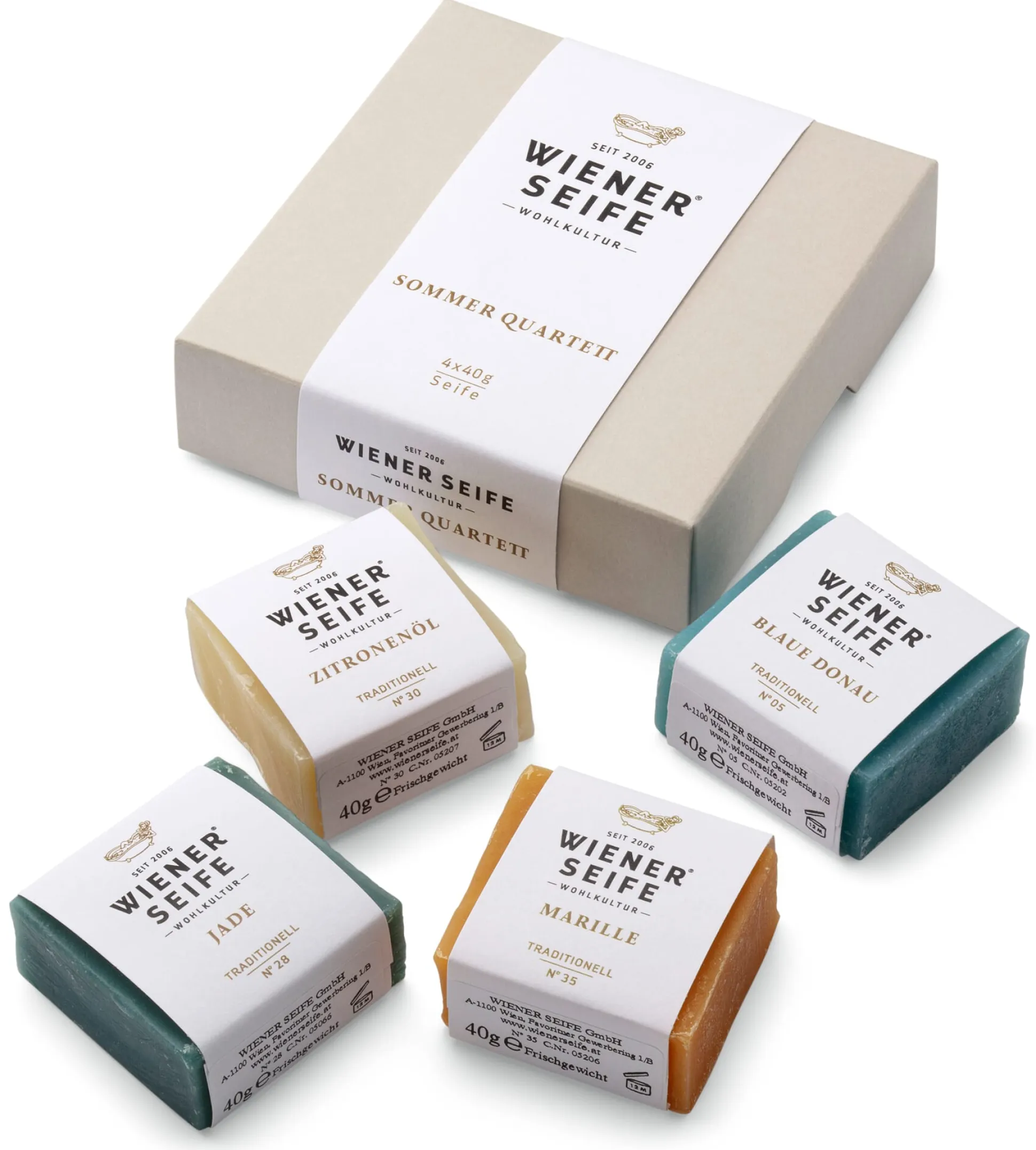 In diesem Sommerquartett sind vier kleine Pflegeseifen aus der Wiener Seifenmanufaktur zusammengestellt. Sie eignen sich als sommerlich frisch duftendes Präsent – auch wenn Sie sich selbst beschenken möchten.