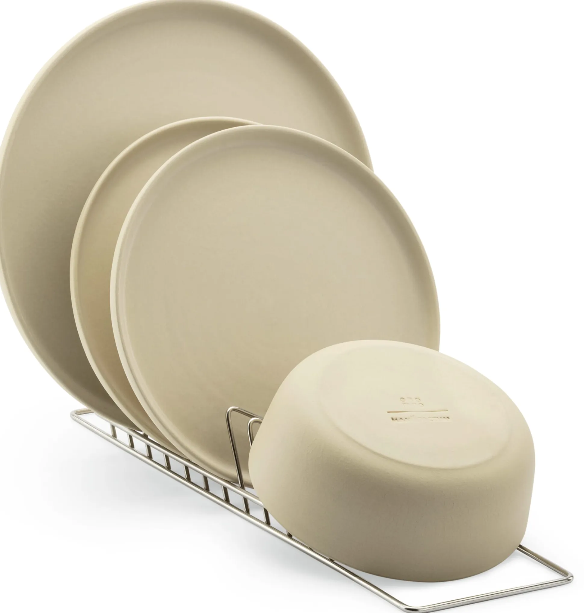 Dieses kleine Gestell aus Edelstahl ist einerseits die Minimalversion eines Abtropfgestells, andererseits können Sie darin auch hervorragend Teller im Regal aufbewahren, vorzugsweise wenn diese nicht übereinanderstehen sollen, damit man jederzeit gezielt einzelne Teller herausgreifen kann. Der italienische Hersteller fertigt das Geschirrgestell aus rostfreiem Edelstahl. Praktisch bei diesem Modell ist der umlaufende, 3 Millimeter starke Rahmen, der die Teller sicher auf dem Gestell hält, aber vor allem dafür sorgt, dass die Teller mit ihrem Rand nicht auf der Unterlage aufsetzen. So kann auch dem guten Geschirr, dass Sie mit der Hand spülen, nichts beim Abtropfen passieren.