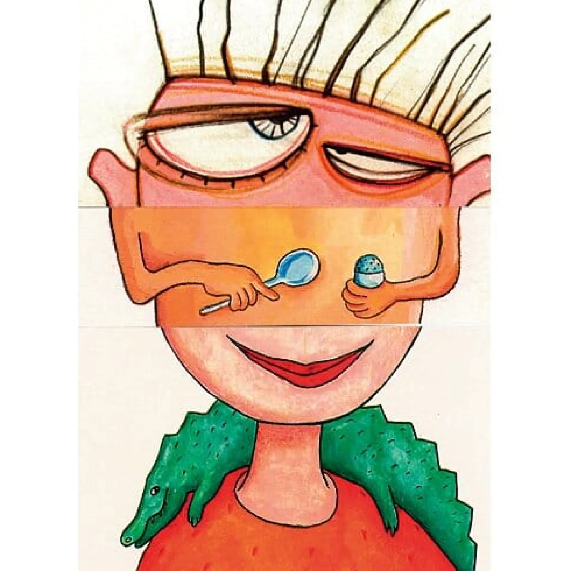 33 namhafte Künstler und Buchillustratoren (u.a. Herbert Achternbusch, Wolf Erlbruch und Rotraut Susanne Berner) rekrutierte der Münchner Verleger Hans-Jürgen Hereth für die Gestaltung eines Gesichter-Legespiels, bei dem die dreigeteilten Porträts im Verlauf des Spiels sinnreich komplettiert werden müssen. Das ist auch mit einem unterdurchschnittlich entwickelten kriminalistischen Gespür zu bewältigen und gebiert neben kuriosen Kreaturen, denen man teils auf der Straße begegnen möchte, teils lieber nicht, merkwürdig vertraute Physiognomien.