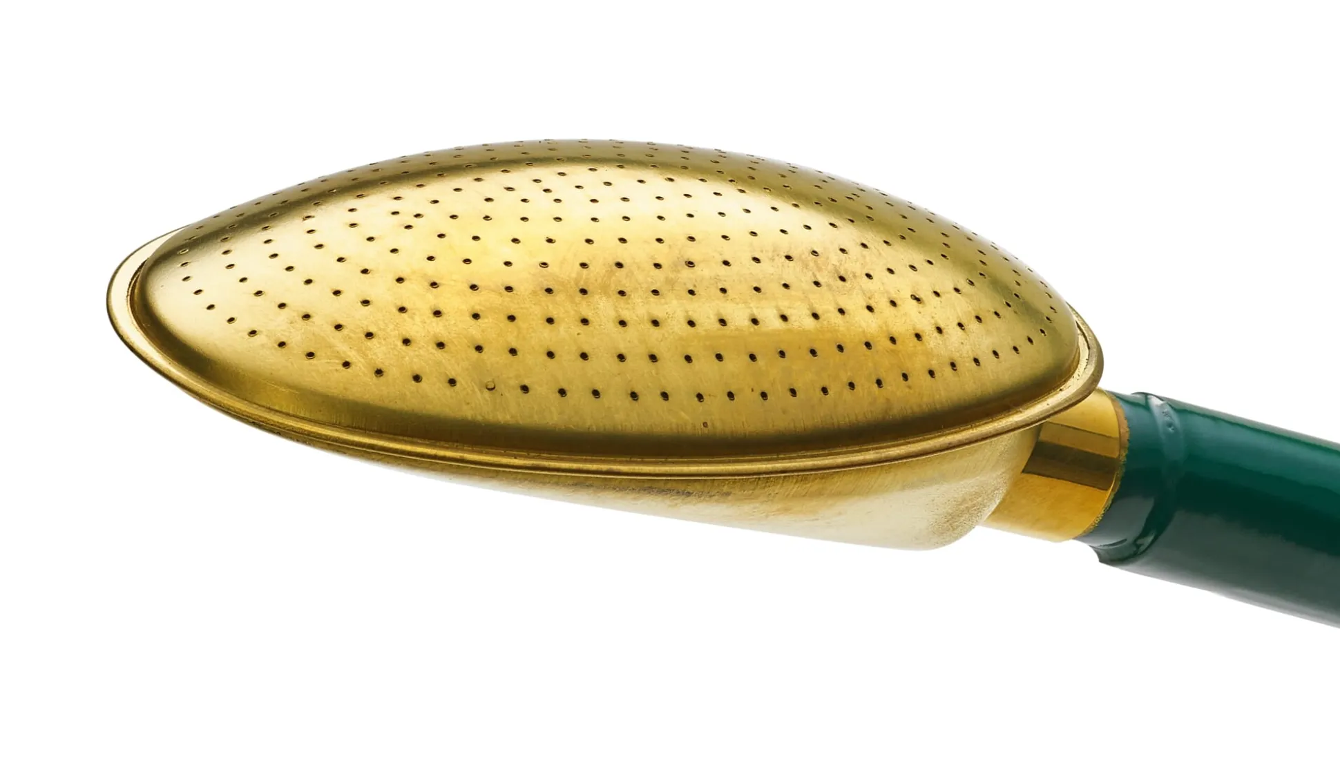 Dank ihrer speziellen Geometrie haben diese Kannen eine beeindruckende Balance und lassen sich leicht tragen. Beim Gießen verhindert der hohe Rand um die Öffnung ein Überlaufen. Aufgrund des langen Ausgusses kann die Gießtülle ohne Bücken dicht über den Boden gehalten werden, sodass die Wasserstrahlen aus den 360 (!) feinen Düsen der ovalen, aufsteckbaren Messingbrause reichlich, aber sanft herausströmen.