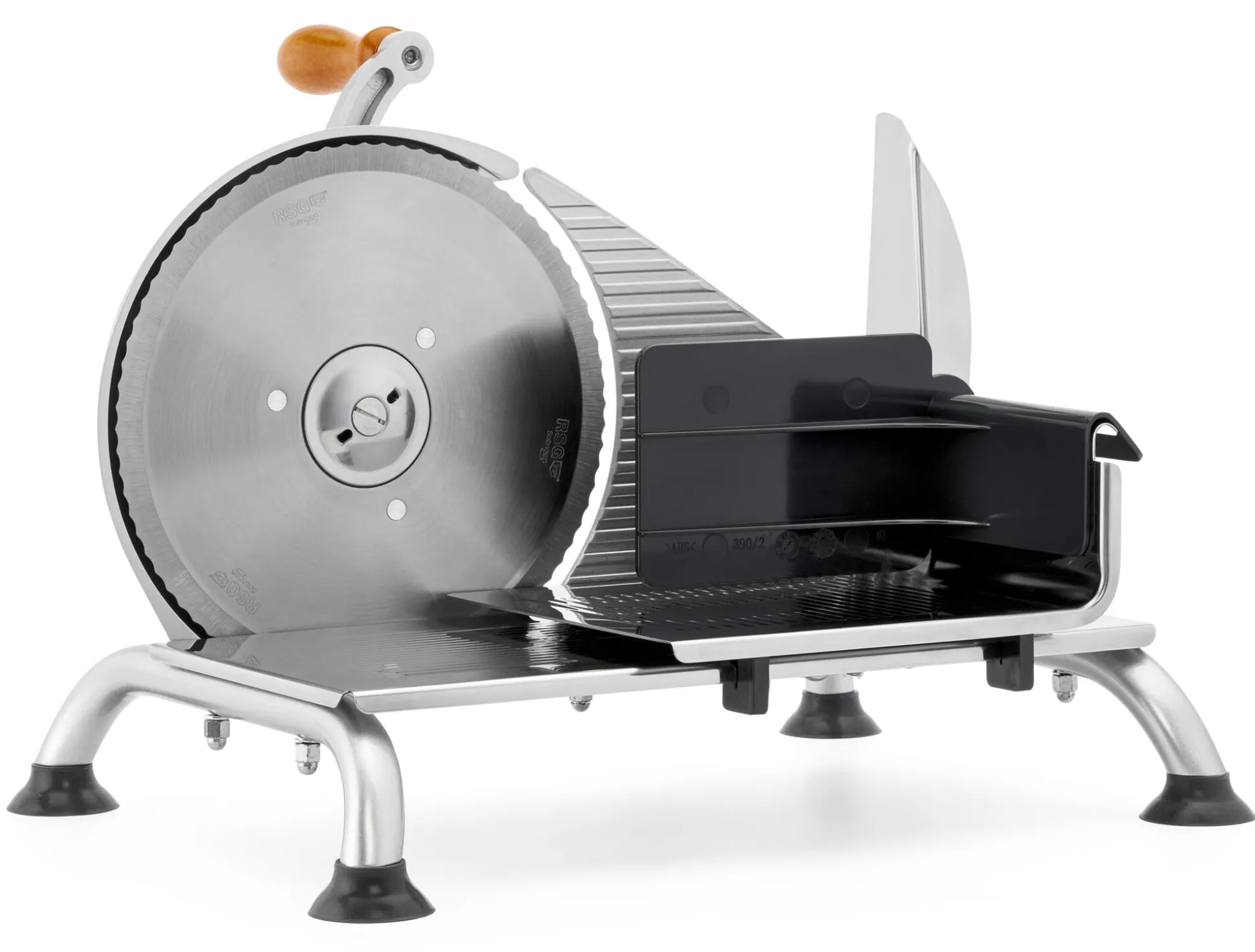 Handbetriebene Aufschnittmaschine. Metallgehäuse. Schlitten Edelstahl. Geschraubte Gummi-Saugfüße. Messer Ø 190 mm, Wellenschliff. Kurbel mit Holzgriff. Im Lieferumfang enthalten ist der Restehalter mit Daumenschutz.