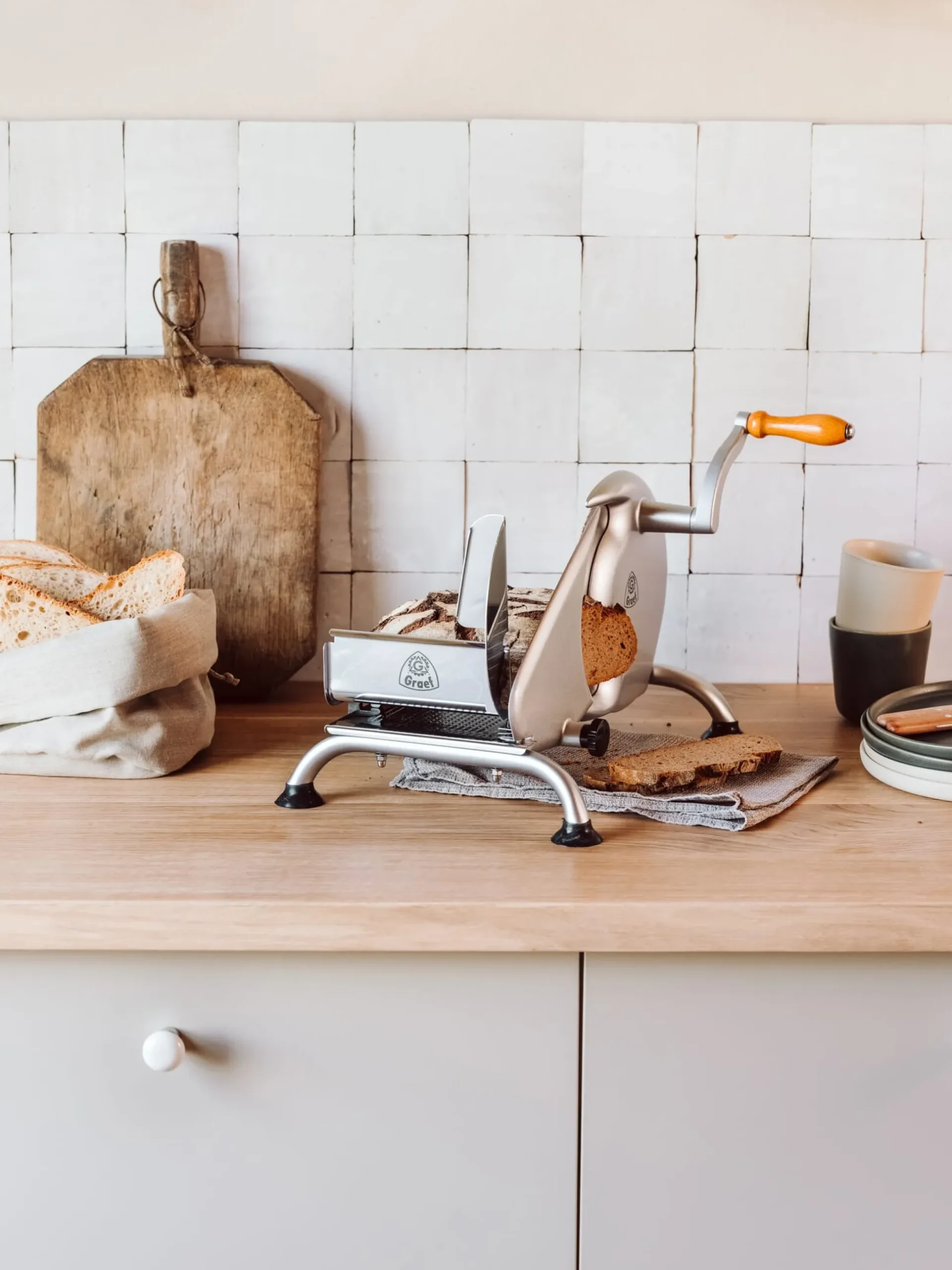 Von Arnsberg im Sauerland nach China und wieder zurück. Nach Jahren der fernöstlichen Fertigung ist die „große Graef“, wie diese schöne Handschneidemaschine seit Jahr und Tag bei uns genannt wird, nach Hause zurückgekehrt. So wird das Gerät nun bereits seit einiger Zeit wieder von Grund auf in Arnsberg hergestellt. Das große Messer mit Wellenschliff kommt wie gewohnt aus Solinger Fertigung.