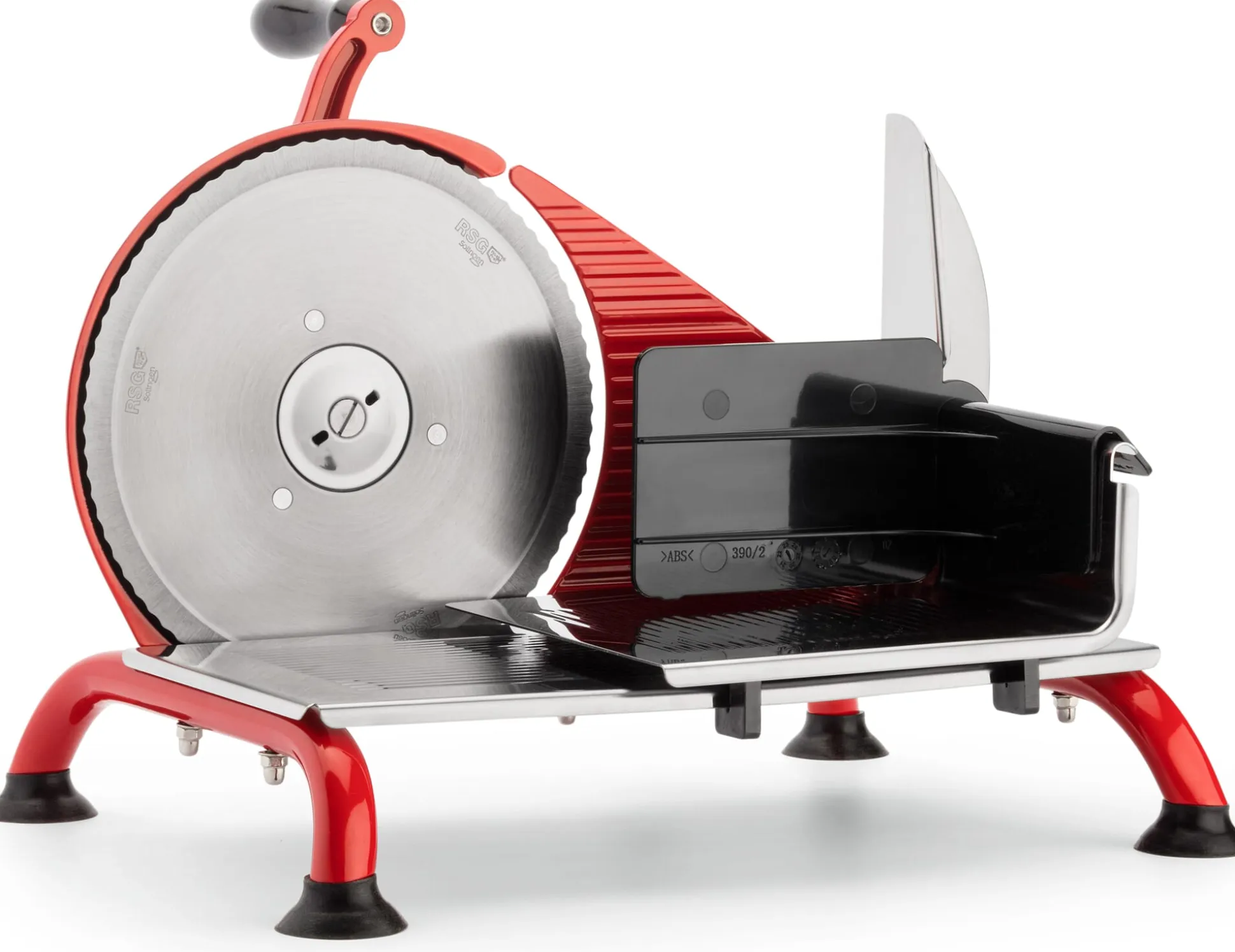 Handbetriebene Aufschnittmaschine. Metallgehäuse. Schlitten Edelstahl. Geschraubte Gummi-Saugfüße. Messer Ø 190 mm, Wellenschliff. Kurbel mit Holzgriff. Im Lieferumfang enthalten ist der Restehalter mit Daumenschutz.