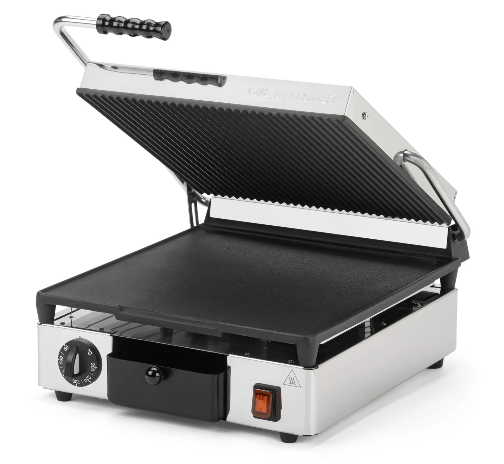 Kommt Ihnen dieser Grill bekannt vor? In ganz Italien zählt der elektrische Kontaktgrill aus dem Hause Milantoast seit den 1960er Jahren zum Inventar von Bars und Caffès. Es ist das Original: der erste in Italien entwickelte und hergestellte Kontaktgrill überhaupt. Ein klassisches Gastronomiegerät, 24 Kilogramm schwer und wirklich zuverlässig, mit keramikbeschichteten Grillplatten aus Gusseisen im soliden Edelstahlgehäuse. In der heimischen Küche von Vorteil: die quadratische Grundform dieser Ausführung nimmt etwas weniger Stellfläche in Anspruch als ein rechteckiges Kontaktgrill-Modell – und dennoch können Sie die ganze Familie oder eine kleine Gästeschar problemlos zeitgleich mit Gegrilltem versorgen. Denn dafür reicht der Platz auf den Grillplatten in jedem Fall aus.