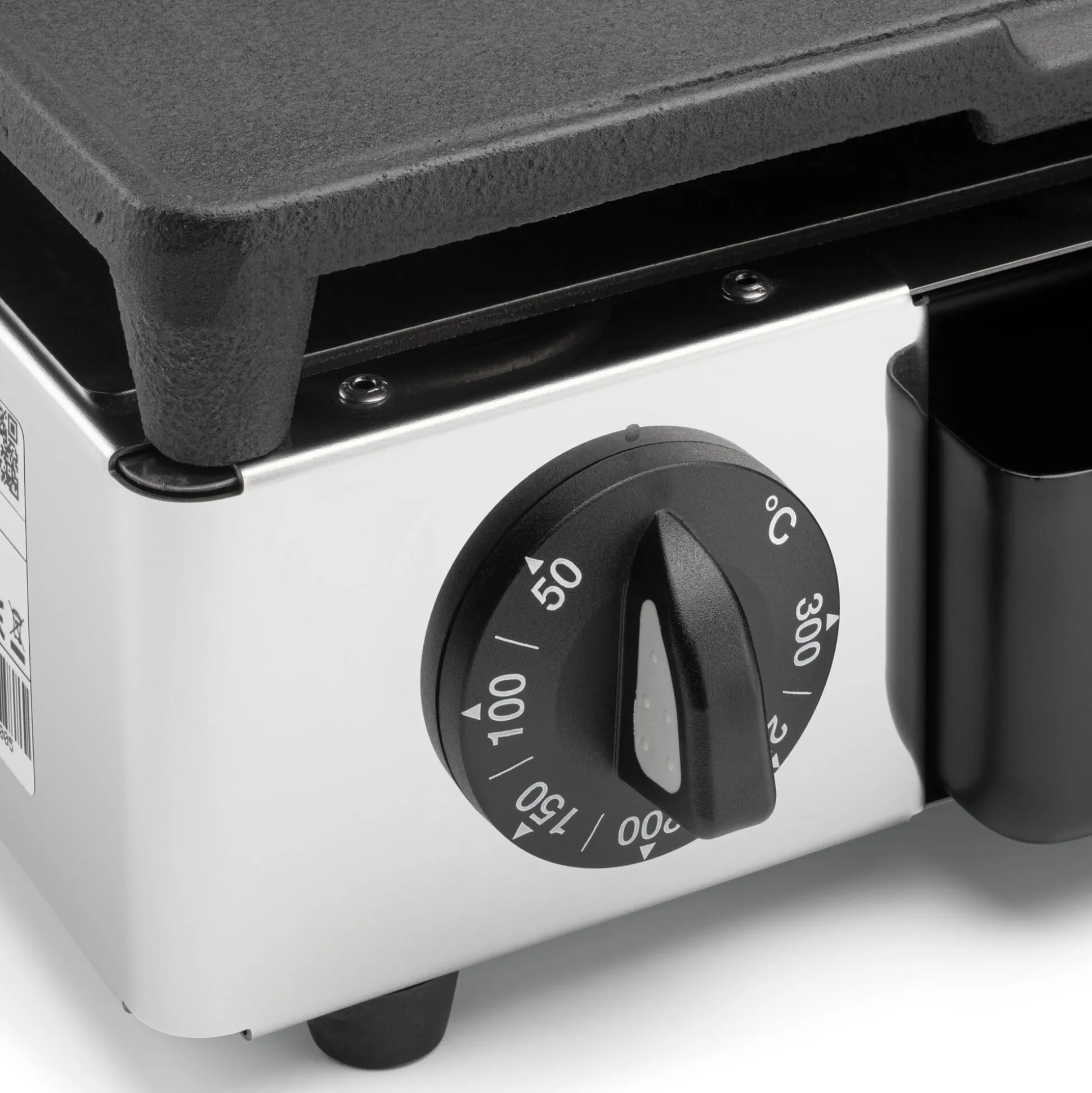 Variable Temperatureinstellung (bis 300 °C). Mit Thermostat und Temperaturkontrollleuchte. Gehäuse Edelstahl, Grillplatten aus keramikbeschichtetem Gusseisen. Grillfläche 35 x 35 cm. Deckelgriff Duroplast (schwarz). Auffangschale lackiertes Stahlblech. Leistungsaufnahme 2,9 kW. Schutzkontaktstecker (Typ F). Höhe 17 cm, Breite 39 cm, Tiefe 48 cm. Gewicht 24 kg. Kabellänge 1,15 m. Lieferung mit Reinigungsbürste, aber ohne Dekoration.
