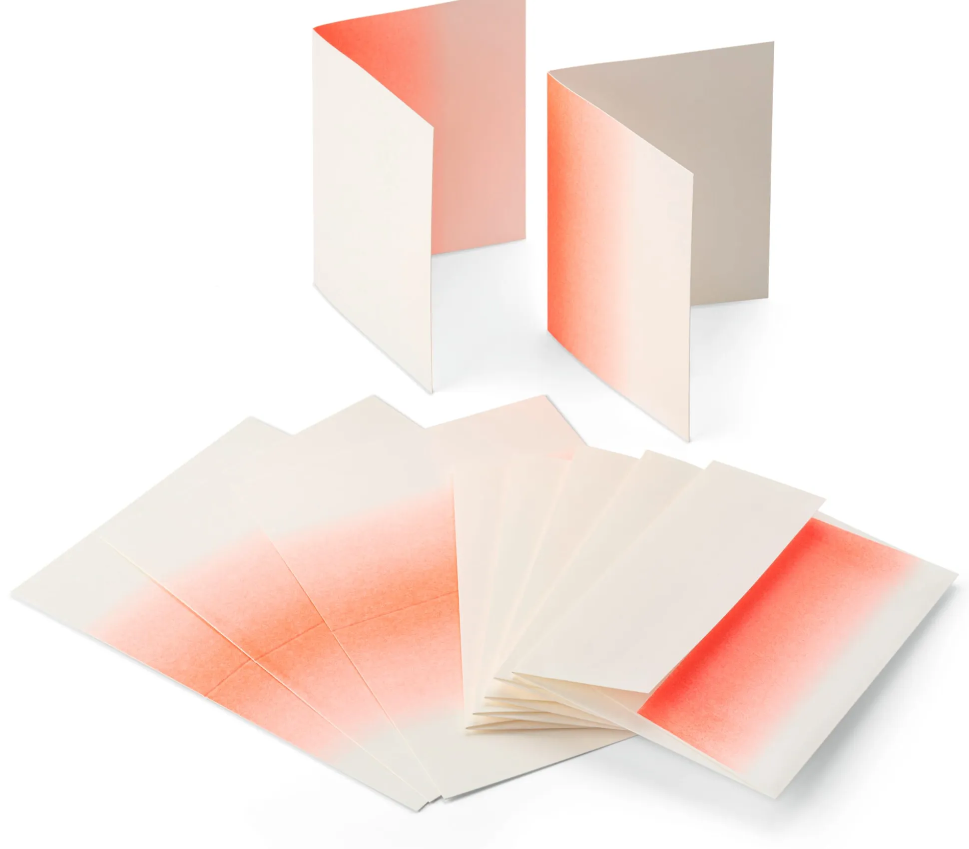 Leuchtende Grüße zu jedem Anlass. Dieses Set aus fünf Klappkarten mit passenden Kuverts ist zwar anlassneutral gehalten, aber dennoch – oder gerade deshalb – besonders schön. Der neon-orangene Farbververlauf grüßt nämlich auffällig mit und lässt die Wahl: Farbverlauf außen? Oder Farbverlauf innen? Die Karten werden offen geliefert und können nach Belieben geklappt, beschrieben, bemalt, bekritzelt und anschließend in das passende Kuvert gesteckt werden – das seinerseits den fast plastisch wirkenden Farbverlauf trägt. Ob Schönschrift, unleserliche Klaue oder Kinderkritzeln – in Kombination mit dem kräftigen Farbdruck wirkt (fast) alles grafisch wohlplatziert und gut gemacht.