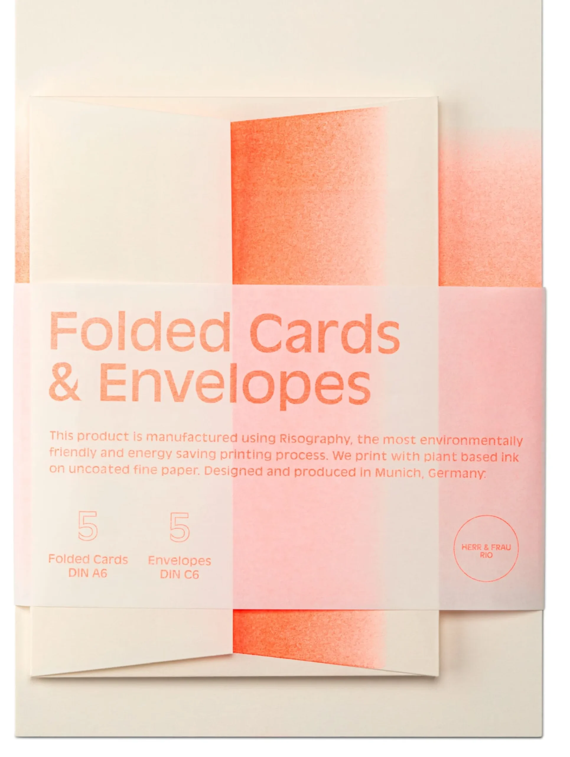 Die Karten sind im Risographie-Druckverfahren auf cremeweißem, samtigen Munken-Papier gedruckt. Die Kuverts ebenso und stammen aus dem Hause Colorplan. DIN A6 / DIN C6.