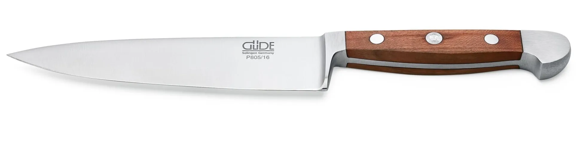 Bei diesem geschmiedeten Messer aus dem 1910 gegründeten Solinger Betrieb von Franz Güde ist am Ende des Griffes ein zweiter Kropf ausgeschmiedet; dieses zusätzliche Gewicht verlagert den Schwerpunkt des Messers nach hinten und gibt ihm damit eine überlegene Balance. Alle Güde-Messer sind aus rostfreiem Messerstahl, eisgehärtet (56 HRC), handabgezogen und handgeschärft. Wir bieten sie in zwei Varianten an: mit Griffschalen aus Pflaumenbaumholz und – wie bei Profimessern schon länger erforderlich – mit solchen aus dem thermoplastischen Kunststoff Polyoxymethylen (POM). Alle Griffschalen sind mit Edelstahlnieten befestigt.