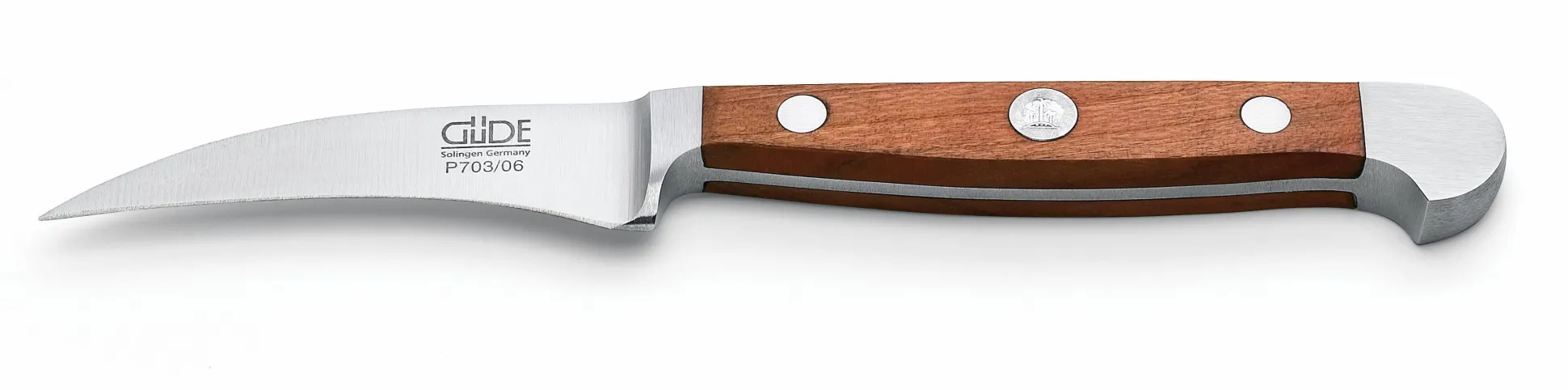 Bei diesem geschmiedeten Messer aus dem 1910 gegründeten Solinger Betrieb von Franz Güde ist am Ende des Griffes ein zweiter Kropf ausgeschmiedet; dieses zusätzliche Gewicht verlagert den Schwerpunkt des Messers nach hinten und gibt ihm damit eine überlegene Balance. Alle Güde-Messer sind aus rostfreiem Messerstahl, eisgehärtet (56 HRC), handabgezogen und handgeschärft. Wir bieten sie in zwei Varianten an: mit Griffschalen aus Pflaumenbaumholz und – wie bei Profimessern aus hygienischen Gründen schon lange üblich – mit solchen aus dem thermoplastischen Kunststoff Polyoxymethylen (POM). Alle Griffschalen sind mit Edelstahlnieten befestigt.