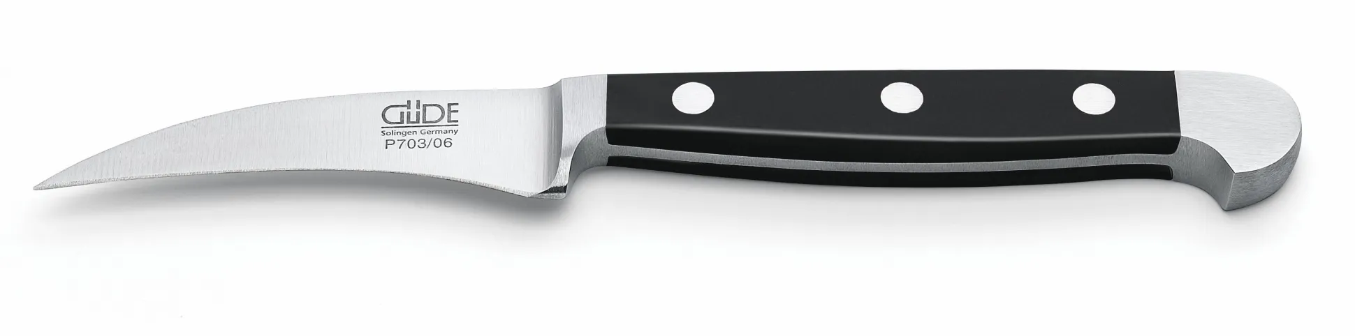 Bei diesem geschmiedeten Messer aus dem 1910 gegründeten Solinger Betrieb von Franz Güde ist am Ende des Griffes ein zweiter Kropf ausgeschmiedet; dieses zusätzliche Gewicht verlagert den Schwerpunkt des Messers nach hinten und gibt ihm damit eine überlegene Balance. Alle Güde-Messer sind aus rostfreiem Messerstahl, eisgehärtet (56 HRC), handabgezogen und handgeschärft. Wir bieten sie in zwei Varianten an: mit Griffschalen aus Pflaumenbaumholz und – wie bei Profimessern aus hygienischen Gründen schon lange üblich – mit solchen aus dem thermoplastischen Kunststoff Polyoxymethylen (POM). Alle Griffschalen sind mit Edelstahlnieten befestigt.